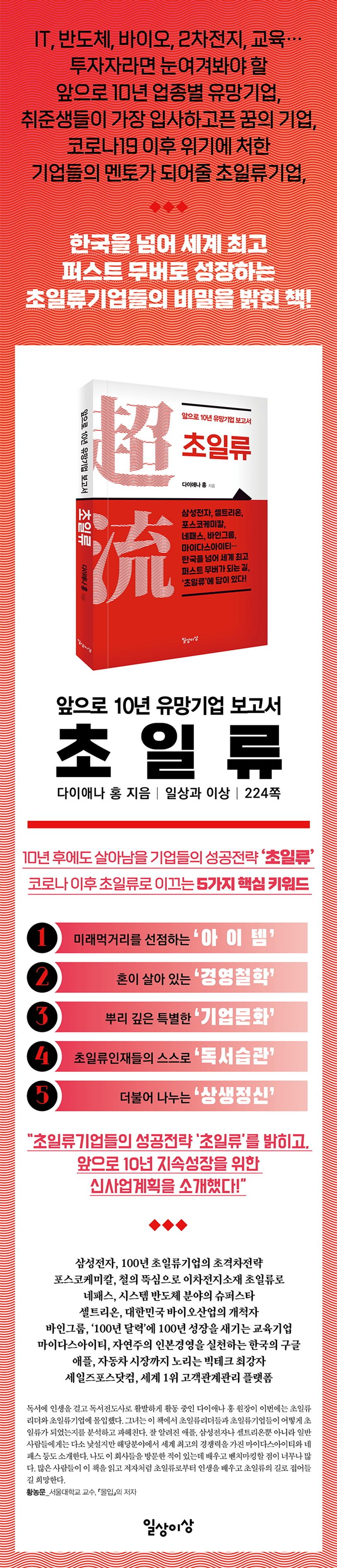 이 책의 지은이 다이애나 홍은 지난 15년간 삼성, 포스코, 현대, SK 등 여러 기업에서 CEO와 임직원을 대상으로 독서경영 강의를 해왔는데, 여러 기업 현장에서 보고 듣고 느낀 바를 토대로 10년 후에도 살아남을 기업들의 성공전략 ‘초일류’를 발견했다.