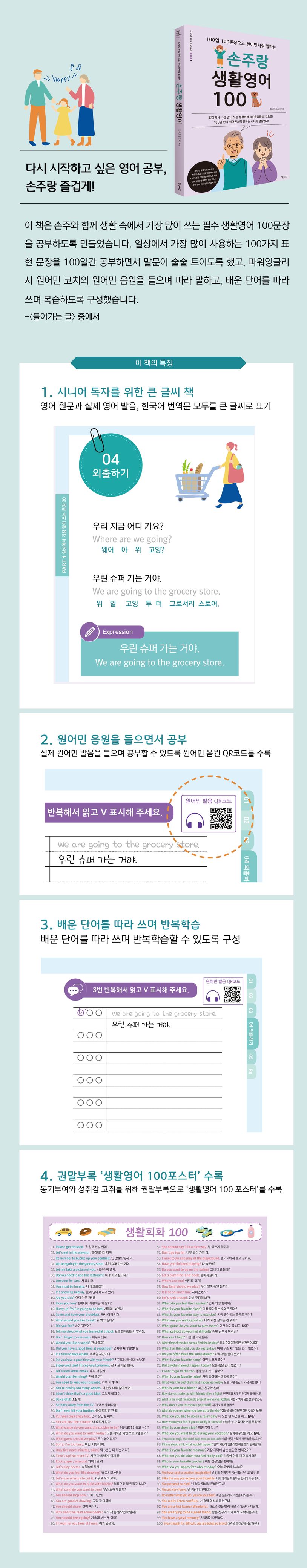 이 책은 시니어 독자가 손주와 함께 생활 속에서 가장 많이 쓰는 필수 생활영어 100문장을 공부하도록 만들었다. 일상에서 가장 많이 사용하는 100가지 표현 문장을 100일간 공부하면서 말문이 술술 트이도록 했고, 파워잉글리시 원어민 코치의 원어민 음원을 들으며 따라 말하고, 배운 단어를 따라 쓰며 복습하도록 구성했다.