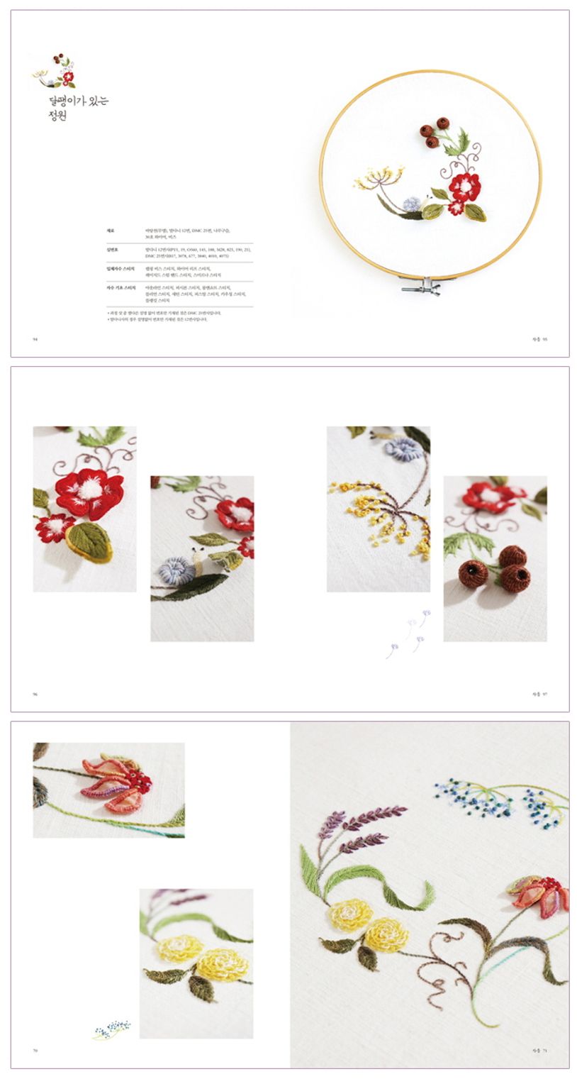 자연을 바라보고 그 사랑을 그대로 손끝에서 만들어내는 『꽃 피는 정원의 입체자수』. 이미 알고 있던 기초 자수 기법에 알록달록 비즈를 달거나 애플리케이션 같은 간단한 기법을 추가하는 것만으로 풍성한 자수 작품을 완성할 수 있다는 자신감을 전하며 아기자기한 수틀 속 정원을 통해 안락함과 평안함을 얻을 수 있도록 도와준다.
