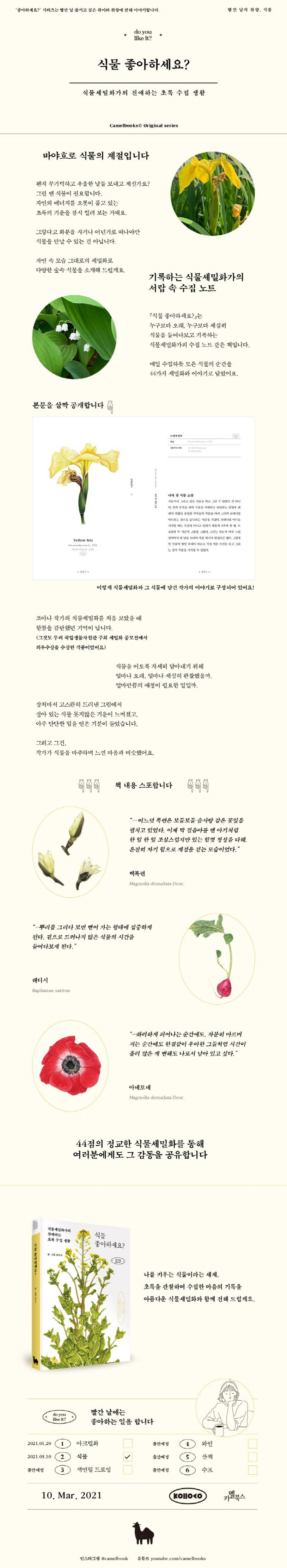 취미와 취향의 세계를 넓혀 갈 ‘좋아하세요?’ 시리즈. 두 번째 주제는 식물이다. 완성도 높은 식물세밀화로 국립생물자원관 주최 세밀화 공모전에서 최우수상을 수상한 조아나 작가의 식물과 함께하는 일상을 공개한다. 매일 수집하듯 모은 식물의 순간을 44가지 세밀화와 이야기로 담았다. 누구보다 오래, 누구보다 세심히 식물을 들여다보고 기록하는 식물세밀화가의 서랍 속 수집 노트 같은 책.