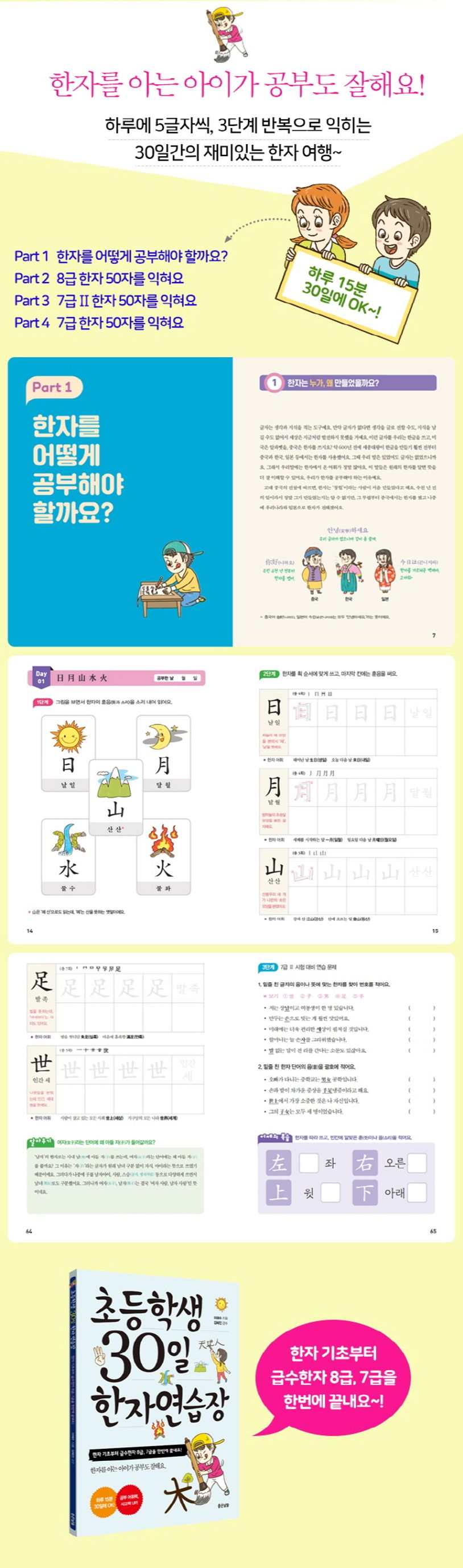 한자 공부는 평생 성적으로 이어지는 학습 어휘력과 독서력, 생각하는 힘을 길러 줘요. 하루에 15분, 30일 동안 쉽고 재미있는 한자 여행을 떠나 보아요!