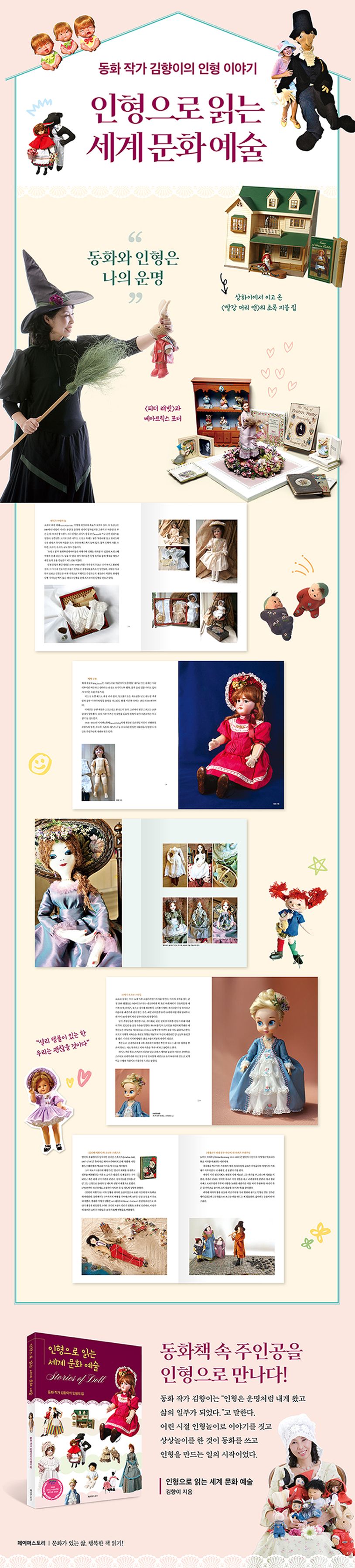 이『인형으로 읽는 세계 문화 예술』은 동화 작가 김향이가 오랜 세월 수집한 인형을 통해 세계 문화 예술 이야기를 쉽고 재미있게 풀어낸 ‘인형의 문화사’이다. 다양한 소재와 지역, 인형에 얽힌 이야기를 풍부한 사진 자료와 함께 엮어 놀이문화 탐구, 작품 소개, 인형 만들기 등을 꼼꼼하게 기록한 책이다. 직접 만들거나 여행지에서 만난 인형들 하나하나에 숨결을 불어넣어 스토리를 만들고 꿈과 희망의 메시지를 책에 담았다. 유럽, 미국, 일본, 동남아의 인형에 얽힌 이야기, 동화책 속 주인공 이야기, 영화와 그림 작품에 소개된 주인공 인형을 통해 독자들에게 세계 각국의 문화와 예술을 체험하는 기회를 제공하고 있다. 여기에 인형이 탄생하기까지의 이야기를 더해 작가의 인형 이야기는 풍성한 스토리가 쌓여갔다. 앤티크 인형, 동화책 속 주인공 인형, 인형의 집 등 세계 여러 나라의 소녀들이 가지고 놀던 인형 이야기와 한국의 어린이들이 좋아하는 캐릭터 인형들이 이 책에 모두 담겼다.