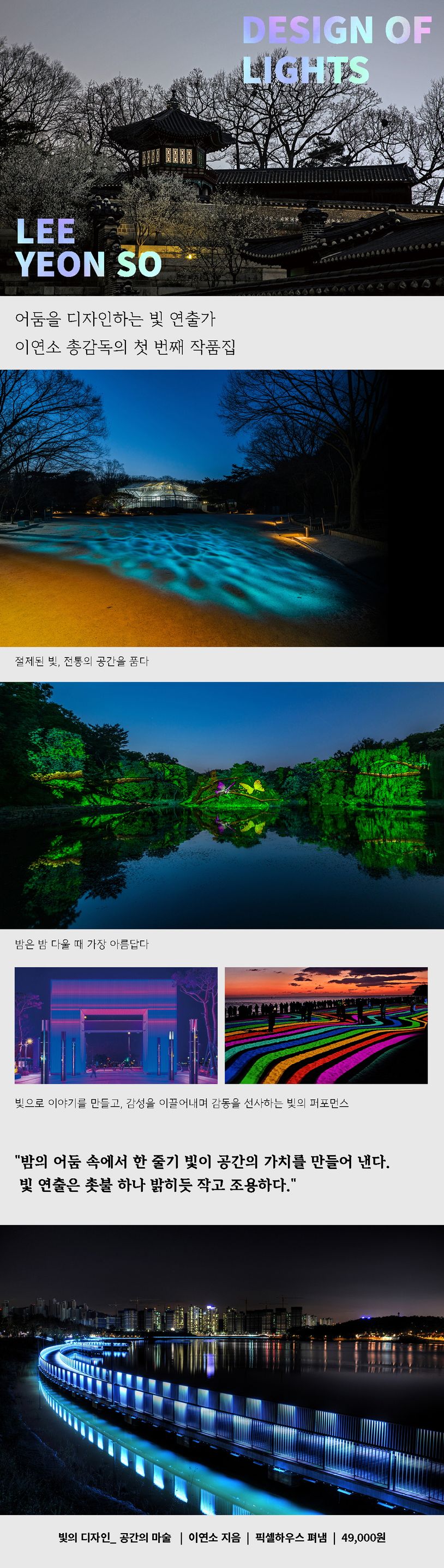 빛 공해로 가득한 도시에서 진정한 밤의 감성과 빛의 감동을 경험하기란 매우 어렵다. 밤은 본래 모든 것을 품을 만큼 어둡고 깊다. 그 어두움에서 출발하는 이연소 총감독의 빛 연출은 본연의 밤 풍경에서 세밀한 빛의 변화를 만들어낸다. 빛은 담아 내야 할 대상이 무엇이냐에 따라 때로는 따뜻하고, 청량하며, 역동적이고, 강렬하다. 밤의 풍경으로 시작되는 책의 시작은 ‘빛의 시’처럼 쓰인 생각의 단편들이다.