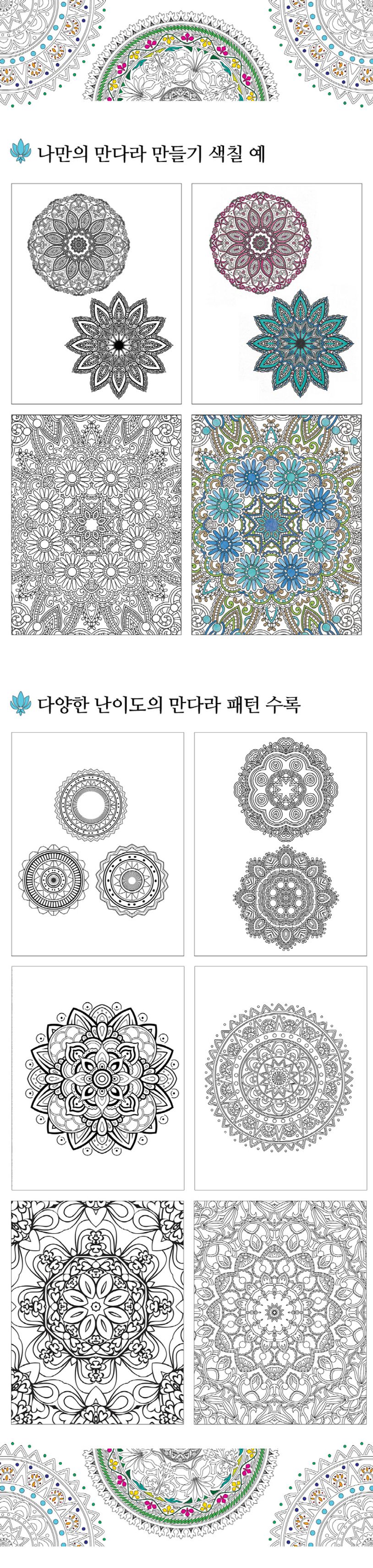 만다라 명상과 미술치료, 이제 컬러링북으로 경험해 보자. 고대 인도어로 ‘원’을 뜻하는 만다라는 티베트불교에서 수행의 하나로 전해져 왔다. 최근에는 명상과 미술치료 도구로 인기가 높다. 만다라 특유의 안정감과 균형의 미는 보는 사람의 마음을 편안하게 해준다. 이 책에는 126쪽에 걸쳐 모두 138개의 만다라 패턴이 수록돼 있다. 단순하고 쉬운 것부터 세밀하고 복잡한 것까지, 난이도가 다양해 컬러링북 초보자는 물론 미술 전문가 모두가 만족할 수 있다.
