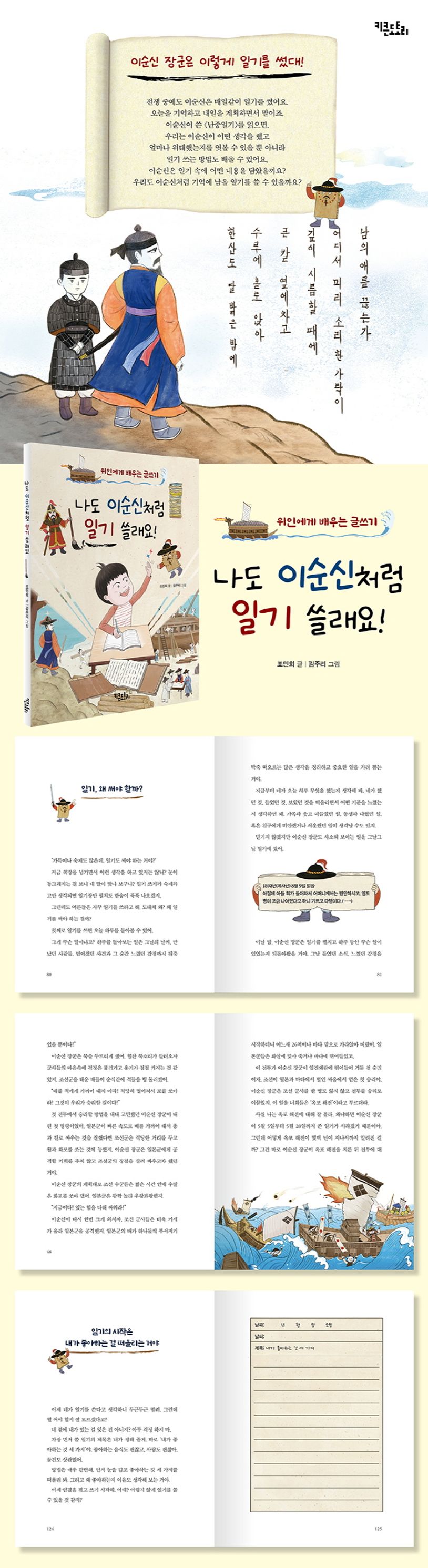 먼저 위인전을 보듯 이순신의 일대기를 이야기하고, 일기 쓰기의 방법, 일기 쓰기의 핵심 요소 등 일기 쓰기 속으로 들어간다. 마지막으로는 실제로 일기 쓰기에 도전해 볼 수 있는 장을 마련했다.
