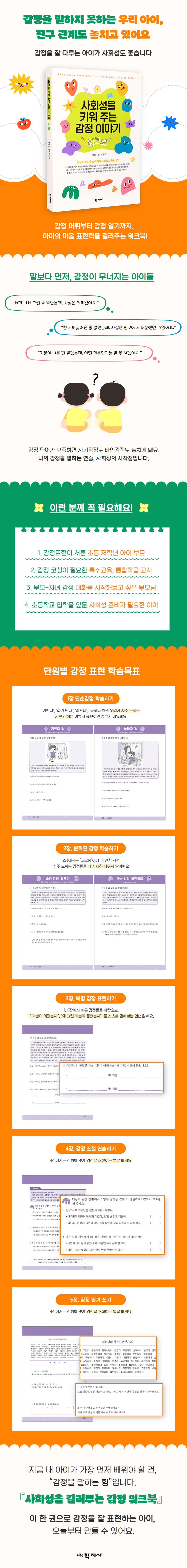 감정을 잘 다루는 능력은 단순한 기분 조절이 아니라, 아이가 사람과 관계를 맺고, 세상과 소통하며, 자기 삶을 건강하게 이끌어갈 수 있는 가장 중요한 기반입니다. 『사회성을 키워 주는 감정 이야기 워크북』은 아이들이 자신의 감정을 이해하고 표현하며 조절하는 힘을 기를 수 있도록 돕는 감정 발달 안내서입니다.