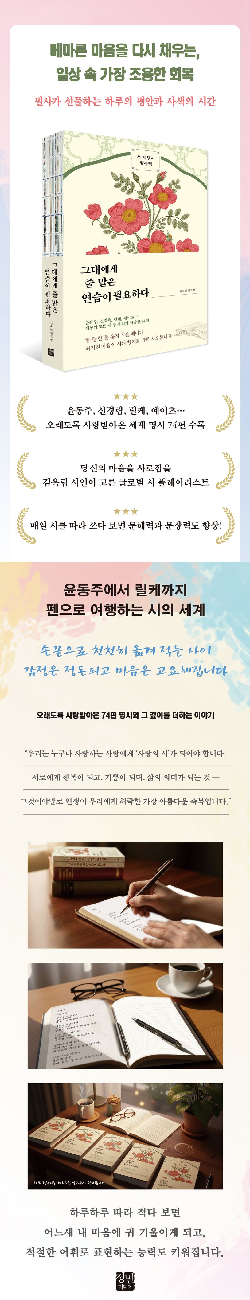 바쁜 세상 속에서 펜을 들고 이 명시들을 따라 쓰는 일은 곧 나에게 집중하는 고요한 명상과도 같습니다. 그 순간, 우리의 내면에 잠들어 있던 ‘사랑이라는 맑고도 아름다운 별’이 서서히 깨어납니다. 시인이 고통과 사색을 견디며 길어낸 문장들을 손끝으로 되새기는 동안 일상의 무거움은 잦아들고, 내면 깊숙한 곳에서 투명한 감성이 맑게 피어오릅니다.