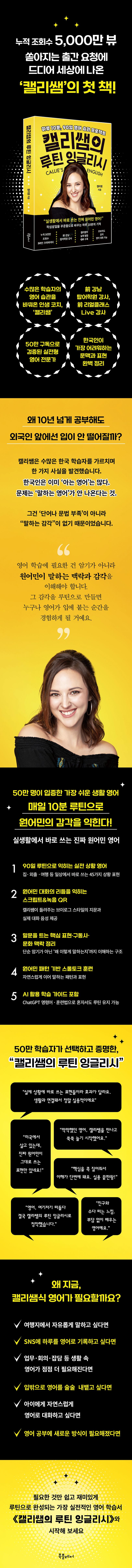 《캘리쌤의 루틴 잉글리시》를 따라가다 보면 원어민의 말하는 감각이 어느 순간 ‘내 말’처럼 자연스럽게 흘러나오게 된다. 단어를 따로 외우거나 문장을 억지로 암기하지 않아도, 매일 10분씩 반복되는 루틴 속에서 표현들이 몸에 스며들기 때문이다. 실제 생활 장면을 기반으로 한 브이로그형 지문, 바로 따라 말할 수 있는 음원, 상황별 스몰토크 훈련까지 결합해, 영어가 머릿속에서 번역 없이 바로 입 밖으로 나오는 경험을 만들어준다. 원어민의 영어 감각을 루틴으로 익히는 최초의 생활 영어 학습서인 《캘리쌤의 루틴 잉글리시》가 당신의 영어 생활을 완전히 바꿔줄 것이다.