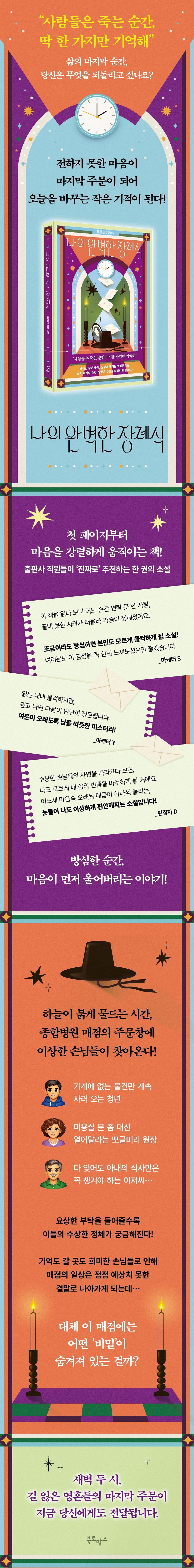 스무 살의 주인공 나희는 병원 매점에서 야간 근무를 시작한 뒤, 인적 드문 밤마다 설명할 수 없는 존재들과 하나둘 마주하게 된다. 도움이 필요한 사람을 도통 지나치지 못하는 나희에게, 해 질 녘부터 찾아오는 손님들은 외면할 수 없는 존재다. 나희는 이들의 부탁을 거절하지 못해 타인의 삶과 죽음에 깊숙이 관여하게 되고, 동시에 조금씩 예상치 못한 진실에 다가선다. 이는 바로 손님들의 주문에 모두 전하지 못한 마음들이 얽혀 있다는 사실이다.