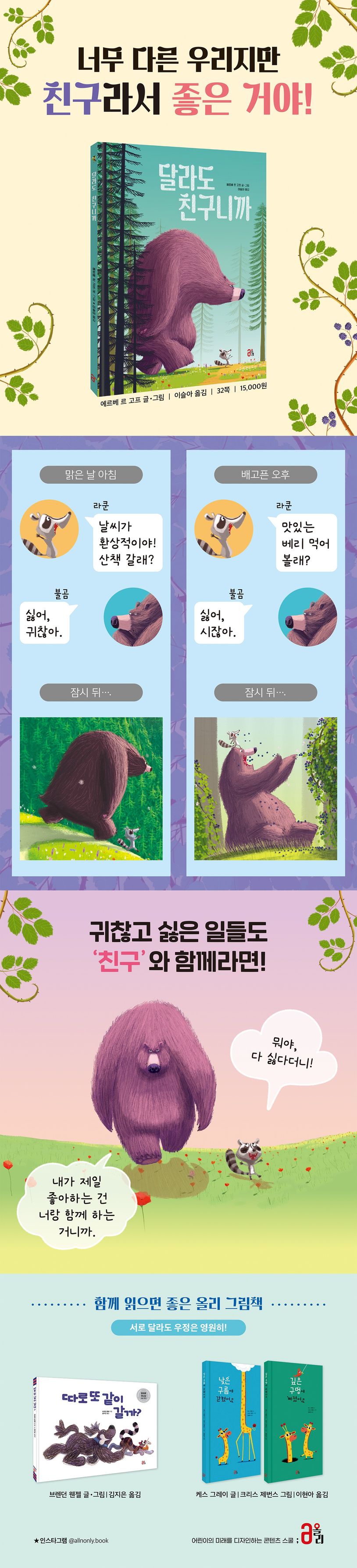 모든 게 하기 싫은 불곰과 무엇이든 하고 싶은 라쿤의 우정 이야기! 라쿤이 함께 하자고 제안하는 일마다 “싫어!”라고 말하는 불곰. 하지만 다음 장면에는 어느새 라쿤과 함께 산책을 하고, 목욕을 즐기고, 베리를 맛보며 웃고 있는 불곰의 모습이 나온다. 서로 달라도 친구가 될 수 있고, 무언가를 함께 할 때 즐거울 수 있다는 사실을 유쾌하게 풀어낸 작품이다.