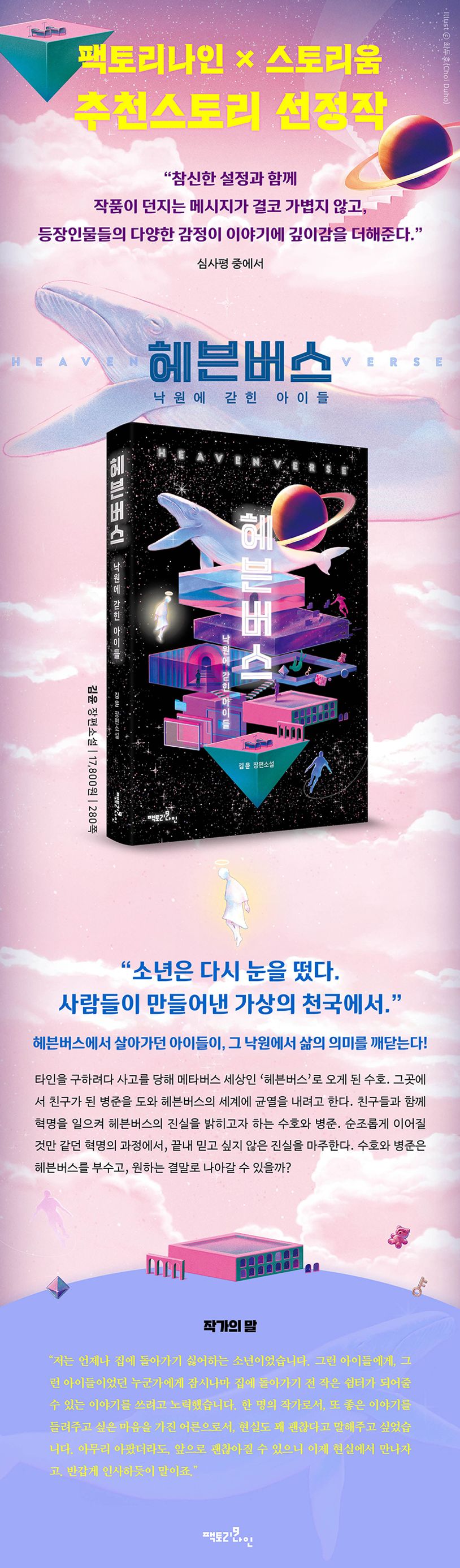 세상에없는새로운키워드를제안하는‘팩토리나인’과한국콘텐츠진흥원이운영하는창작·제작연계플랫폼‘스토리움’이공동주최하며화제를불러일으킨‘팩토리나인×스토리움추천스토리’선정작《헤븐버스:낙원에갇힌아이들》이팩토리나인에서출간되었다.“참신한설정과함께이야기에깊이감이있다”는심사평을받으며선정된이번신작은‘우리가한번쯤해봤을법한상상을특유의개성으로뚜렷하게표현해내는’김윤작가의개성이듬뿍담겨있는작품이기도하다.