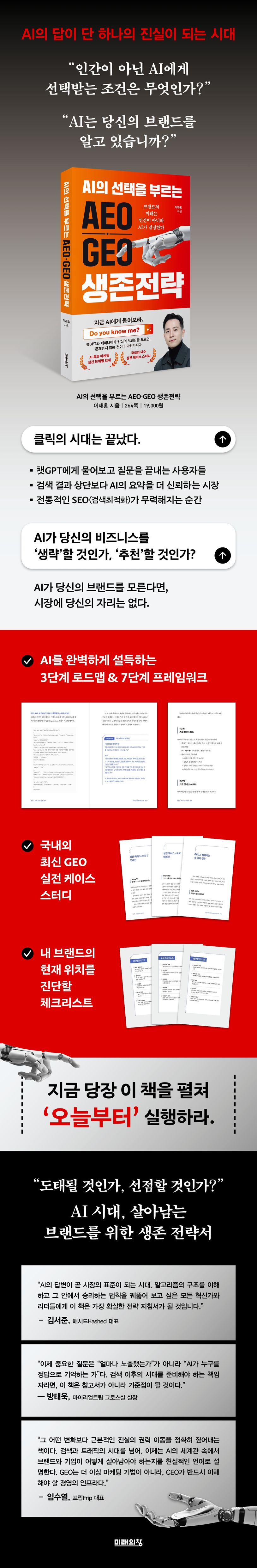 이 책은 단순히 방법론을 기술하는 데 머무르지 않는다. 당장 실무에 적용할 수 있는 국내외 케이스 스터디와 GEO가 실패하는 치명적인 이유를 분석하는 동시에, 개인과 기업을 넘어 국가적 AI 주권과 글로벌 패권 전쟁으로 확장되는 GEO의 거대한 미래 청사진을 날카롭게 통찰한다.