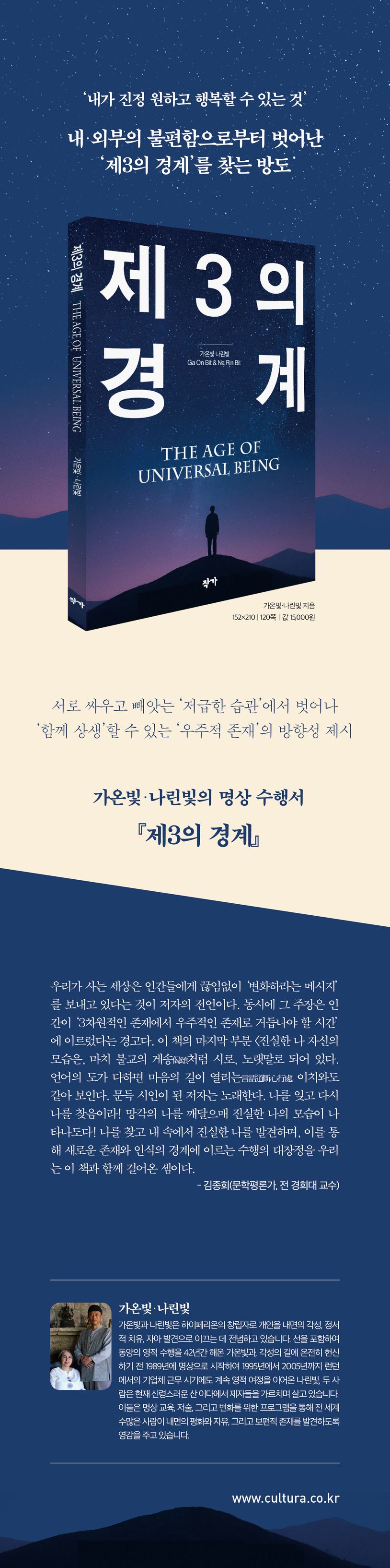 40년 이상 영적 수행과 명상 교육을 이어온 가온빛과 나린빛이 수행적 사유록 『제3의 경계』를 도서출판 작가에서 출간했다. 두 저자는 수많은 개인에게 내면 각성과 정서적 치유를 통해 삶의 전환점을 맞도록 이끌어 왔다. 이번 책은 그들의 영적 체험과 수행적 통찰을 바탕으로, 현대 문명 전체가 직면한 불안과 혼란의 원인을 근본적으로 재해석하고 새로운 방향성을 제시한다.