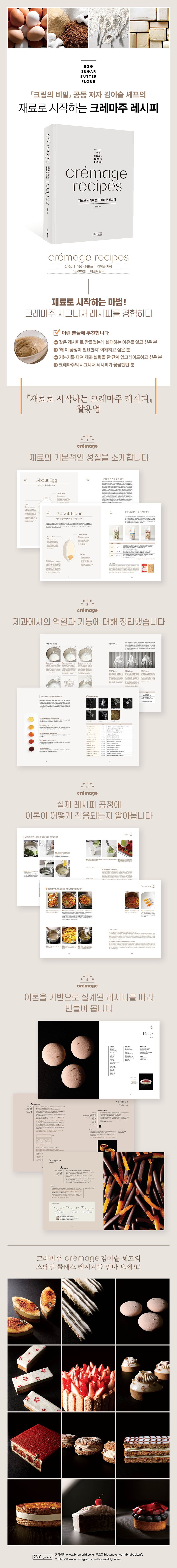 분명 같은 재료로 만드는데 왜 결과는 전혀 다른 것일까? 그 해답을 찾기 위해 이 책은 제과의 출발점이라 할 수 있는 달걀, 설탕, 버터, 밀가루, 네 가지 주재료를 탐구하는 것으로부터 시작한다. 과자 전반의 텍스처를 결정짓는 달걀, 달콤함 이상의 역할을 하는 설탕, 맛과 식감을 좌우하는 버터, 그리고 구조와 결을 만드는 밀가루 등 각 재료가 가진 특성이 각각의 단계에서 어떻게 기능하여 시그니처 제품으로 완성되는지를 생생하게 보여 준다. 이를 통해 독자는 ‘왜 순서를 지켜 작업해야 하는지’, ‘어떤 상태가 기준이 되는지’를 공정 사진을 통해 직접 눈으로 확인할 수 있으며, 재료에 대한 깊은 이해를 바탕으로 보다 자유로운 응용이 가능하다. 또한 『재료로 시작하는 크레마주 레시피』에는 그동안 〈크레마주 제과 스튜디오〉의 프라이빗 클래스 외 어디에서도 공개한 바 없는 크레마주 시그니처 레시피와 완벽함을 추구하는 김이슬 셰프의 생생한 팁이 가득 실려 있다. 따라서 제과 전문가라면 누구나 궁금했을 크레마주의 감각적인 디자인과 놀라운 구성의 디저트를 경험할 소중한 기회가 될 것이다.