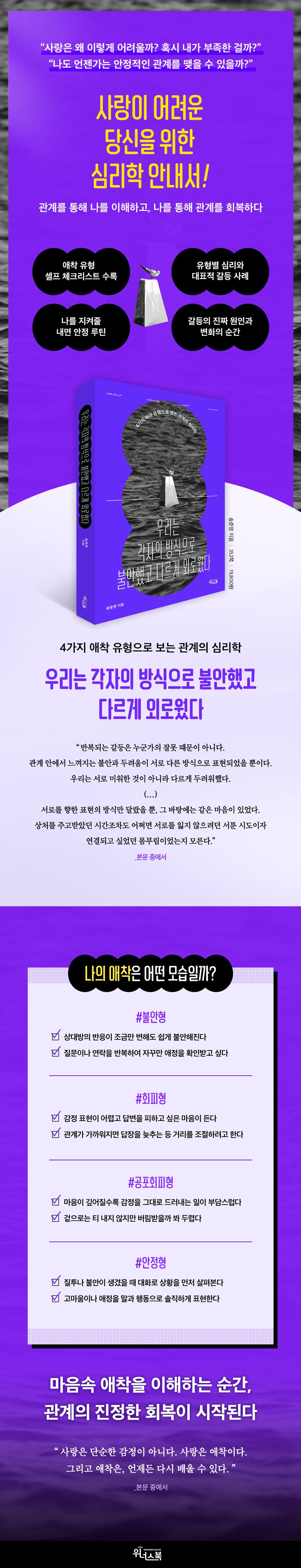 관계가 깊어질수록 불안과 외로움이 커지는 사람들을 위해 사랑의 뿌리이자 갈등의 근원인 ‘애착’을 조명한다. 누군가와 긴밀한 사이가 되었을 때 자꾸만 비슷한 싸움이 반복되는가? 가까운 관계에서 편안함과 안정감 대신 불안과 답답함, 두려움 같은 감정을 더 자주 느끼는가? 그렇다면 내면의 애착으로 시선을 돌려야 한다. 저자 송준영은 사랑이 애착, 즉 과거로부터 기인한 오래된 정서적 습관과 깊은 관련이 있다고 말한다. 마음이 깊어질수록 비슷한 패턴의 갈등이 반복되는 것은 결코 개인의 성격이나 의지 탓이 아니며, 경험과 노력을 통해 불안정한 애착을 개선할 수 있다고 본다. 이 책은 애착이 형성되는 과정부터 각 유형이 두려움을 처리하는 방식, 유형별 갈등의 패턴과 변화의 순간, 그리고 진정한 회복으로 나아가는 방법 등을 다룬다. 단지 유형을 나누고 특징을 살피는 것을 넘어, 각자의 마음에 숨겨진 두려움을 이해하고 ‘나’ 그리고 ‘타인’과의 근본적인 화해를 이루도록 돕는다.
