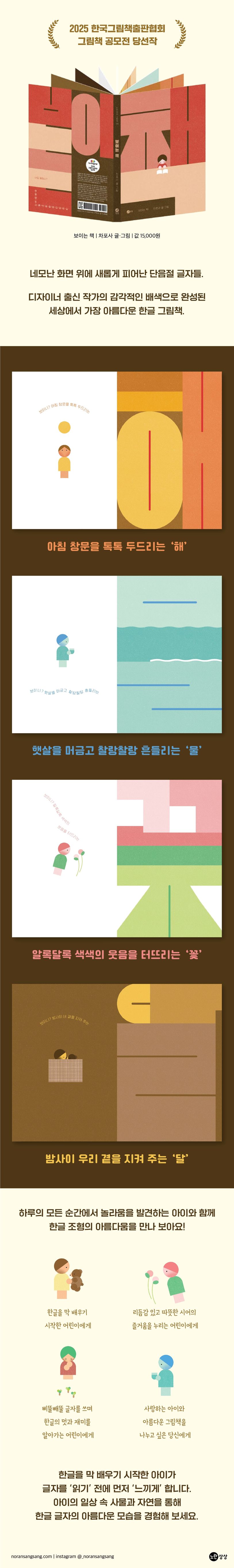 2025한국그림책출판협회그림책공모전당선작한글은아름답다!표음문자인한글에뜻을더해형태와리듬,조형미로먼저만나는우리글자표지한가득독자들의시선을사로잡는‘책’이라는글자부터시작해서,책장을넘길때마다환한빛을내뿜는‘해’,끝없이이어질듯한‘길’,흙을밀어올리는여린‘싹’이라는글자가자연스럽게모습을드러냅니다.소리를구현한표음문자인한글에뜻을더해표의문자로의확장을시도했다고나할까요.한글을처음배우는아이들은낱자보다엄마,사과,고양이같은단어단위(통문자)로인식하는경우가많습니다.이책은새,꽃,길같은단음절단어를활용하여,어린이가이미지연상을통해자연스럽게한글과친숙해지도록돕습니다.네모난화면위에서새롭게탄생한단음절글자들.디자이너출신작가의감각적인배색으로완성된세상에서가장아름다운한글그림책.한글이왜네모난형태를띠게되었는지아시나요?세종대왕이한글을만들때한자처럼네모반듯한모양이글자답다고여겼기때문이라는데요.20세기초에는알파벳처럼풀어쓰기방식이시도된적도있지만,음절단위의인식에민감한우리말을반영하기에모아쓰기방식이적합해원래대로굳어졌다고합니다.모아쓰기방식을취하는글자가없지않지만,자음과모음을기계적으로조합해정사각형음절블록을만드는문자는한글이유일하지요.《보이는책》은이러한한글의본질에충실하면서도아름답게변형하여글자자체의조형미를즐길수있도록만든그림책입니다.글자가담고있는의미를해석하여그래픽디자이너출신작가다운솜씨로능숙하게배색을구현합니다.잔잔하게흔들리는물,구불구불이어지는길,땅에서솟아오른싹같은이미지가글자속에자연스럽게녹아들어있으면서도한글자체의특징을살려,다양한방식으로글자의의미를탐색하게합니다.하루의모든순간이한글로피어나다.시어와글자와이미지가유기적으로결합한풍부한그림책.이책의중심에는글자가있지만,그곁에는그래픽적으로단순하게표현된아이캐릭터가등장해이야기를끌고갑니다.아이는해를맞이하며눈을뜨고,시원한물한잔을마신뒤길을나섭니다.너른들에서새를바라보고,흙과싹과꽃을살피며세상의아름다움을발견하지요.그리고어둠이내려앉으면달이조용히아이를지켜봅니다.이처럼아이일상의사물과자연을탐색하는작은모험과함께한글이등장하여,글자의의미를어린이의몸짓과시선과행동으로확장합니다.“보이니?작고여린손으로힘껏땅을밀어올리는싹”,“보이니?알록달록색색의웃음을터트리는꽃.”시처럼소리내어읽기좋은문장은구부러지고휘어지며이미지와자연스럽게어우러지도록배치하여화면의모든요소가풍부한심상을자아냅니다.기호였던한글을감각과경험으로이해할수있도록,구석구석세심하게기획된그림책입니다.*인증유형:공급자적합성확인