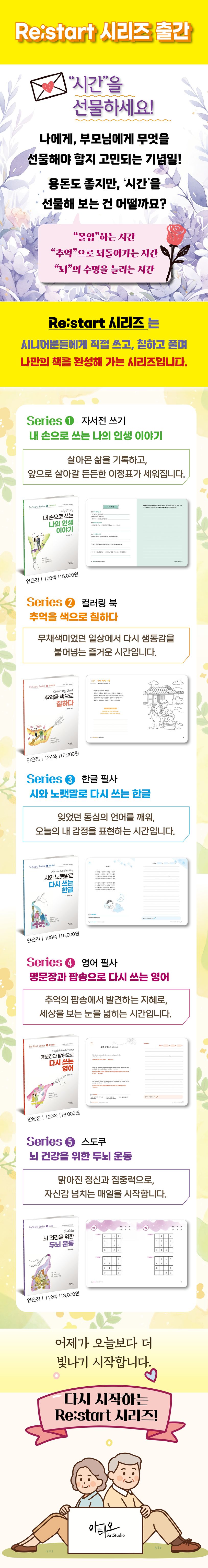 Re:Start Series는 시니어를 위한 라이프 가이드북 시리즈로, 삶의 전환점을 맞이한 당신이 ‘나’를 다시 만나고, 다시 발견할 수 있도록 돕습니다. 이 시리즈는 일, 관계, 건강, 취미 등 다양한 주제를 통해 은퇴 이후의 삶을 풍요롭고 의미 있게 설계할 수 있는 영감을 제공합니다.
