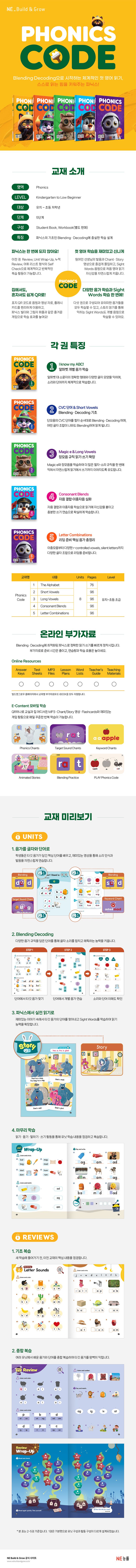 - 파닉스의 기초인 Blending과 Decoding을 중심으로 한 학습 흐름으로 체계적인 학습이 가능합니다.