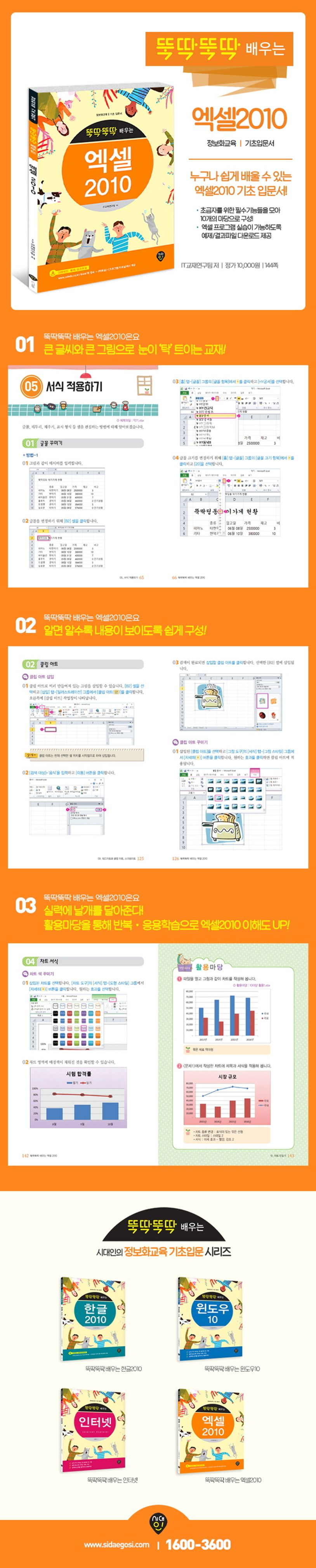 [뚝딱뚝딱 배우는 엑셀 2010]은 엑셀2010의 기초 입문서로, 누구나 쉽게 배울 수 있도록 구성한 책이다. 책에는 엑셀2010 다룸에 있어 필수적으로 알아두어야 할 기능들만을 뽑아 수록했고, [알아두기]를 통해 본문의 내용에서 다루지 않았지만 알아두면 도움이 될 기능들에 대한 정보나 유의사항 등을 담았다. 또한 [활용마당]의 예제 또는 문제를 통해 혼자서 해보는 마무리 학습 형태로 구성하였다.