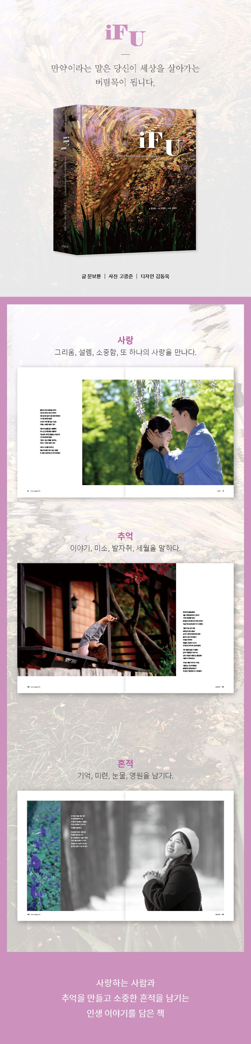 사랑하는 사람을 만나서 추억을 만들고 소중한 흔적을 남기는 인생 이야기를 담아낸 책이다. 만약이라는 말은 우리가 세상을 살아가는데 커다란 버팀목이 되어준다는 것을 보여준다. 지나온 세월 속에 비춰진 모습을 돌아보며 소중하지만 잊고 지낸 것들을 다시 생각해 볼 수 있다.