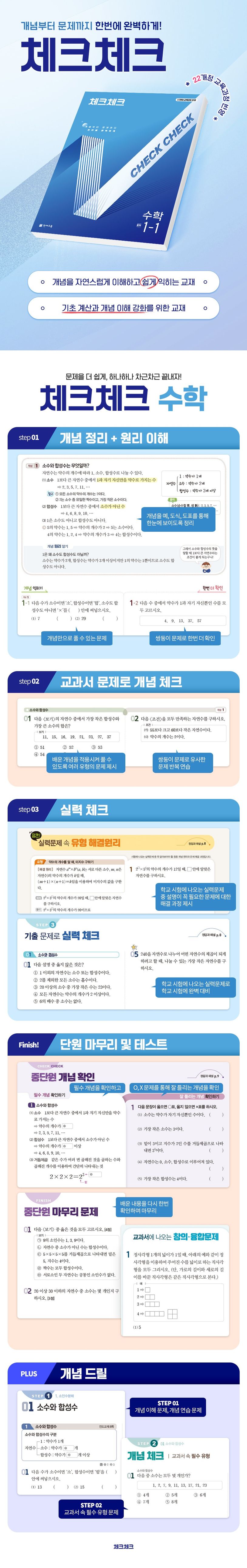 [진도교재]개념을자연스럽게이해하고쉽게익히는교재단원의배경,수학이실생활에적용되는예를흥미롭게구성➜①쉽고자세한개념설명②학교시험기출문제집중분석③실력문제속유형해결원리④단원마무리및테스트⑤교과서에나오는창의·융합문제➜완벽한개념완성[개념드릴]기초계산과개념이해강화를위한교재기초개념,계산연습진도교재Step1을마친후드릴문제로반복연습+개념체크교과서속필수유형문제진도교재Step1을마친후나만의숙제로반복연습➜개념적용능력향상