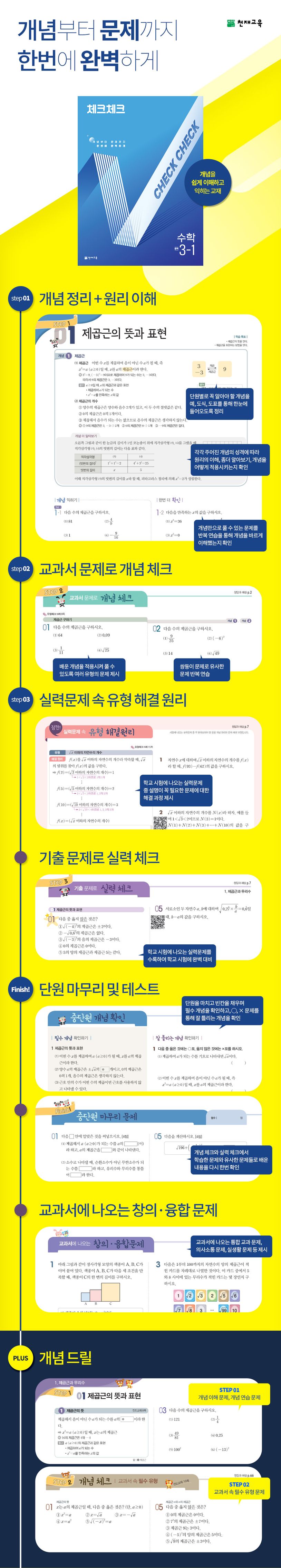 [진도교재]개념을자연스럽게이해하고쉽게익히는교재단원의배경,수학이실생활에적용되는예를흥미롭게구성➜①쉽고자세한개념설명②학교시험기출문제집중분석③실력문제속유형해결원리④단원마무리및테스트⑤교과서에나오는창의·융합문제➜완벽한개념완성[개념드릴]기초계산과개념이해강화를위한교재기초개념,계산연습진도교재Step1을마친후드릴문제로반복연습+개념체크교과서속필수유형문제진도교재Step1을마친후나만의숙제로반복연습➜개념적용능력향상