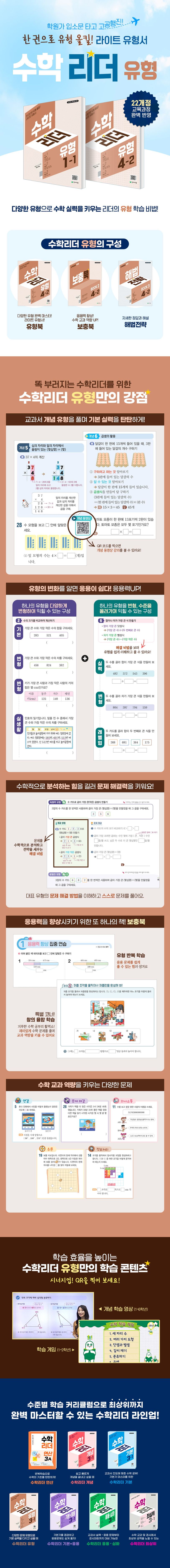 수학리더 시리즈 연산, 개념, 기본, 유형, 기본+응용, 응용⦁심화, 최상위 중에서 다양한 유형으로 실력을 키울 수 있는 유형서이다. 개념서나 기본서로 수학의 기본을 다진 후 수학리더 유형으로 여러 가지 교과서와 익힘책 유형을 연습하며 실력을 올릴 수 있다.