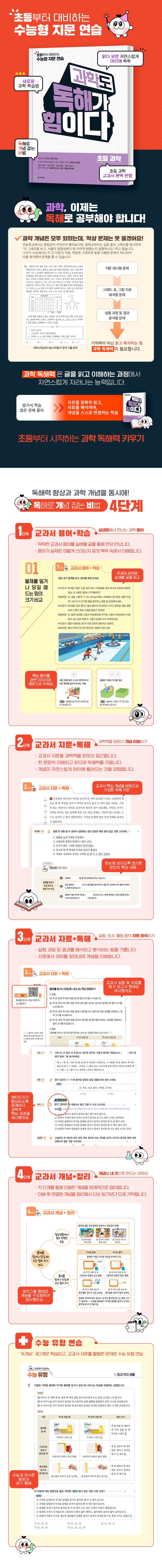 이제는 과학 공부도 단순 암기에서 벗어나 문해력을 기본으로 문제를 해석할 수 있어야 합니다. '과학도 독해가 힘이다'는 과학 독해력과 과학 개념을 동시에 잡을 수 있는 교재입니다. 교과서 용어 학습, 교과서 지문 독해, 교과서 자료 독해, 교과서 개념 정리로 이어지는 4단계 학습을 통해 과학 실력을 체계적으로 키울 수 있습니다. 또한, 지문 독해와 자료 독해를 통해 초등부터 수능 사고력을 기를 수 있으며, 상세한 정답과 풀이를 통해 놓치는 부분 없이 완벽한 학습이 가능합니다.