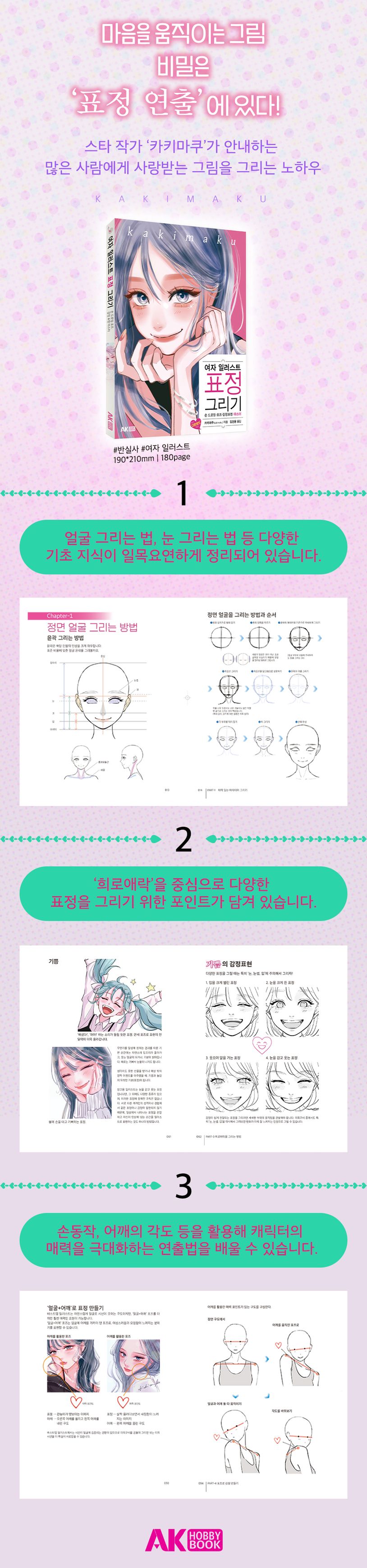 004시작하며007PART1:매력있는여자일러스트그리기008표정이란?감정이란?제스처란?포즈란?013Chapter-1:정면얼굴그리는방법016Chapter-2:옆·대각선얼굴그리는방법020Chapter-3:눈그리는방법028Chapter-4:눈썹그리는방법033Chapter-5:코그리는방법037Chapter-6:입그리는방법042Chapter-7:귀그리는방법045PART-2:머리카락그리는방법046Chapter-1:선을자연스럽게그리는연습을하자!049Chapter-2:다양한헤어스타일그리기 보브커트/쇼트커트/긴머리/트윈테일057PART-3:희로애락을그리는방법060Chapter-1:기쁨067Chapter-2:분노074Chapter-3:슬픔081Chapter-4:즐거움091PART-4:포즈로감정만들기 얼굴과어깨로표정만들기 일러스트를더매력적으로연출하는구도와배치,트리밍,콘트라포스토101PART-5:손을추가해일러스트의매력UP 순서에따라손을그리는방법,드로잉포인트 다양한손을활용하면분위기가바뀐다109PART-6:다양한표정과제스처116Chapter-1:고민에빠진여자아이120Chapter-2:아름다운연상의여성캐릭터124Chapter-3:‘좋았어!’하고기뻐하는여자아이130Chapter-4:‘진짜미안해!’하고사과하는여자아이134Chapter-5:당황하는여자아이139PART-7:윙크그리는법 윙크하는얼굴그리는방법149PART-8:모델같은무표정그리기 몽환적인무표정을그리는방법159PART-9:표지메이킹164VISUALPAGE174마치며