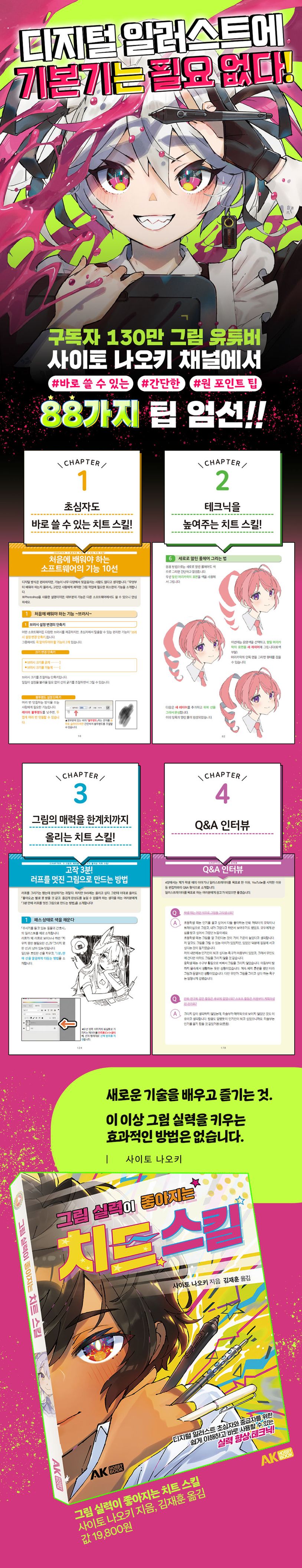 머리말CHAPTER.1초심자도바로쓸수있는치트스킬!잘그리기위해필요한환경만들기1항상그림전체를본다2작업내역기능을사용한다3도구를의심해본다4화면밖의색을연한회색으로한다5자료를옆에둔다6혼잣말을한다7항상하던실수를기억한다8다른사람의그림에서발견한오류를기억한다처음에배워야하는소프트웨어의기능10선처음에배워야하는기능~브러시~1브러시설정변경의단축키처음에배워야하는기능~화면조작~2화면회전3새창처음에배워야하는기능~레이어~4투명픽셀잠그기5클리핑마스크6레이어마스크7레이어이동처음에배워야하는기능~선택도구~8자동선택도구9레이어선택10선택및마스크선을지저분하게그리는요령?!1펜설정을확인하자2짧은선을지저분하게그린다3긴선을지저분하게그린다4모든선을지저분하게그린다5깔끔한선을그린다~실전해설~그림초심자의착각5선!1「틀리면안된다」라는착각2「선부터그려야한다」라는착각3「완성하면끝」이라는착각4「전부제대로그려야한다」라는착각5「많은색을사용하는편이좋다」라는착각그림실력향상법칙3선!1그리는시간을정한다2그릴모티브를정한다3그리는목적을정한다CHAPTER.2 테크닉을높여주는치트스킬!이것이가능하면프로!그림의원칙3가지1처음부터잘그리려고하지않는다2직접포즈를잡아본다3완성한뒤에계속다듬는다색선택의요령5선1요령이전에……단색배색을해보자2요령?유사색배색을배우자3요령?난색과한색을의식하자4요령?흑백으로바꿨을때의대비가중요하다5요령?다색일때는과도한명도차이에주의하자6요령?무채색을효과적으로사용하자머리카락을3배더잘그릴수있는방법1선으로그리는것은어렵다2머리카락을색의면으로그린다3뒷머리와옆머리를색의면으로그린다4포인트머리를색의면으로그린다5마지막에선을그린다6세로로말린롤헤어그리는법음영을넣는간단한방법5선1일부러음영을넣지않는다2역광(림라이트)3렘브란트라이트4스포트라이트5밑에서올라오는빛고작3분!잘그린것처럼보이는일러스트가공테크닉1곡선기능으로대비를높인다2스크린레이어로애틋함을더한다3머리카락끝에그레이디언트를추가한다4그레이디언트맵으로통일감을더한다5음영의그레이디언트를사용한다CHAPTER.3그림의매력을한계치까지올리는치트스킬!그림을기분좋게그리는요령1일부러보류한다2회색으로칠한다3나중에그려넣는다4화면을회전시킨다5순서를파괴한다6흐름이중요하다고작3분!러프를멋진그림으로만드는방법1패스상태로색을채운다2선에색을넣는가공3간단하게음영을넣는가공4그레이디언트맵을사용한가공5소개한테크닉을조합한가공일러스트의귀여움을강조하는비책7가지1목에만동작을더한다2이마의면적을줄인다3귀여움에코는필요없다4입체감을무시한다5눈이아니라속눈썹으로인상을만든다6홍조를더한다7의상에도적당히신경쓰자옆얼굴그리는요령1잘못된옆얼굴그리는법2형태잡는법3옆얼굴을그린다4정면을바라본다5앞으로고개를숙인다6고개를뒤로든다7안쪽눈이약간보이는옆얼굴7단계로배경을간단하게그린다!1무엇을그릴지정한다2색을정한다3원경의실루엣을정한다4중경의실루엣을정한다5전경의실루엣을정한다6세부를묘사한다7화이트를사용해악센트를더한다CHAPTER.4 Q&A인터뷰이책을선택한여러분께