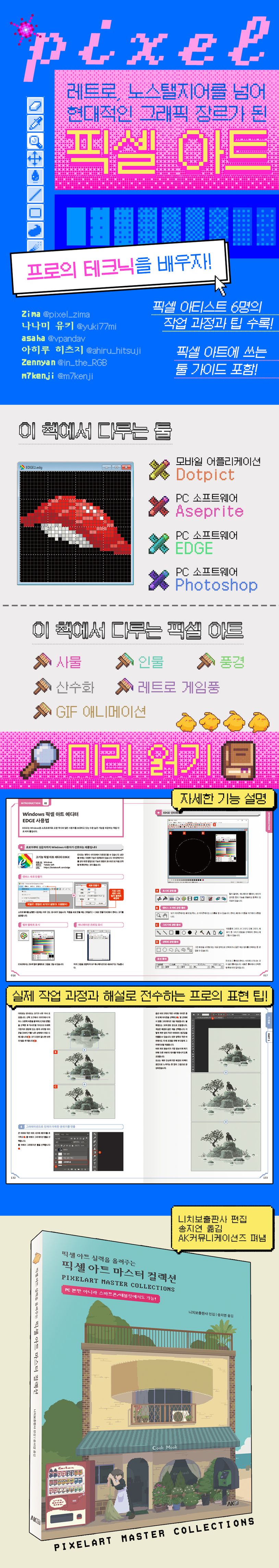 픽셀을조합한그림이나애니메이션을“픽셀아트”라고부릅니다.픽셀아트는오래된비디오게임을연상시키는특유의노스탤지어한분위기를보이기도하고,간략하고소박한스타일의레트로감성과귀여움도느끼게하는매력을지니고있습니다.이제픽셀아트는레트로감성을뛰어넘는새로운방식의스타일이계속등장하며새로운하나의장르로자리잡고있습니다.SNS에서인기를얻고있는픽셀아트작가들로부터그들의테크닉을배워봅시다.
