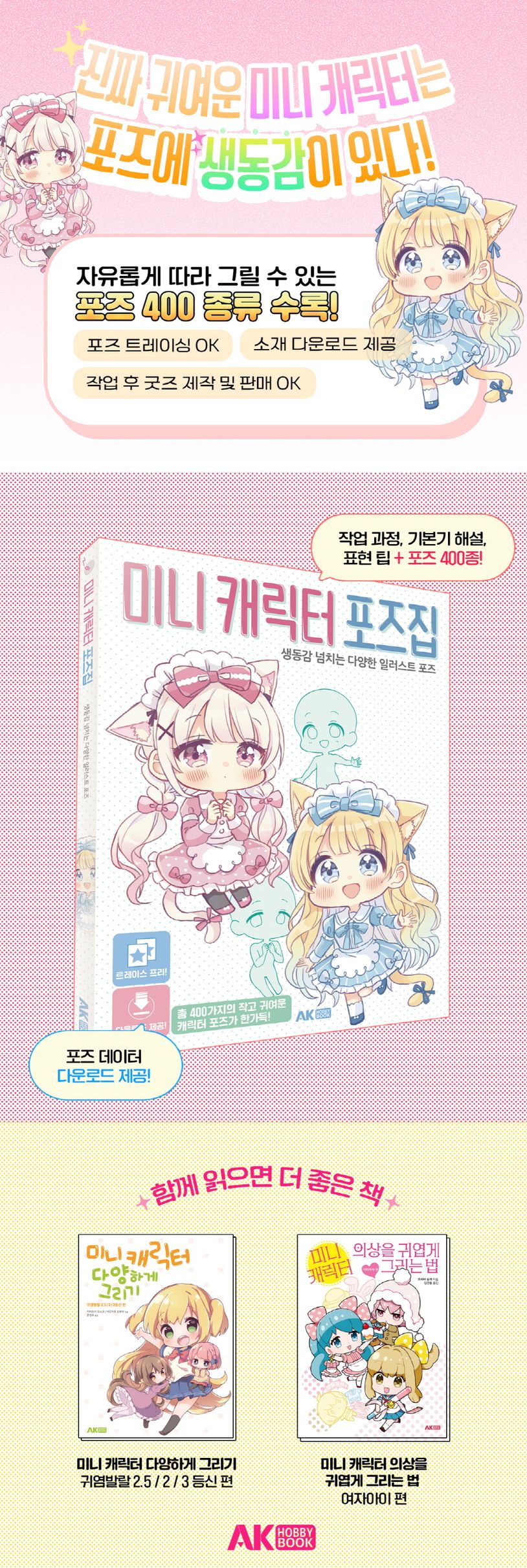 총 400가지의 작고 귀여운 캐릭터 포즈 수록. 자유롭게 사용할 수 있는 일러스트 포즈 데이터를 제공한다. 포즈 소재에 의상과 헤어스타일을 추가해 자신만의 미니 캐릭터 일러스트를 완성해보자.