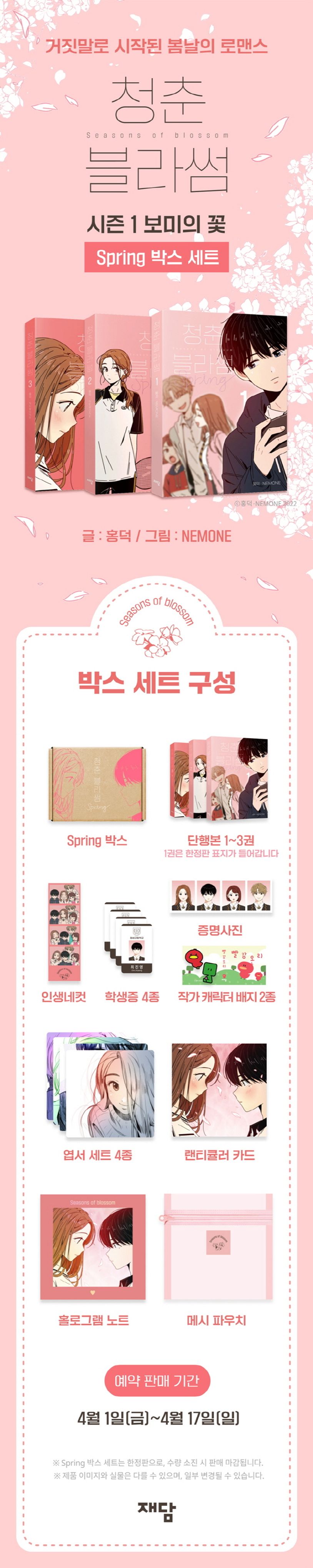 1권Episode1.보미의꽃1~11화특별부록이세계블라썸①2권Episode1.보미의꽃12~21화특별부록이세계블라썸②3권Episode1.보미의꽃22~29화TMI네컷만화그어느날밤의이야기특별부록이세계블라썸③