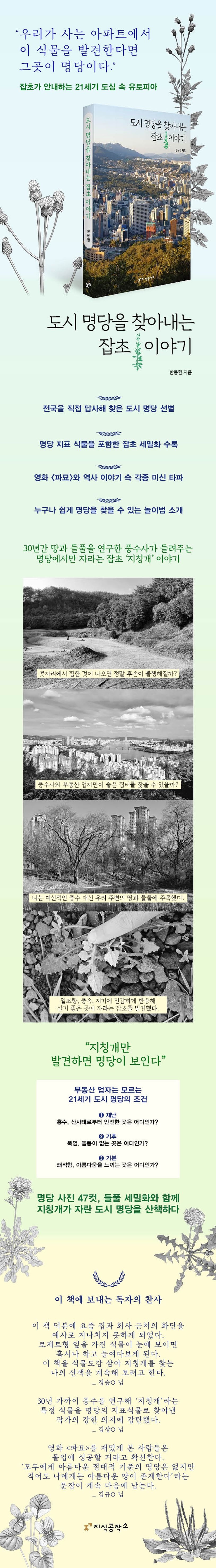 명당에서만 자라는 잡초가 있다. 30년간 자연학에 기초한 풍수를 공부한 저자 한동환은 신비적인 풍수에서 벗어나 아파트, 공원, 궁궐 등을 산책하며 명당에서만 자라는 한 잡초를 발견한다. 이 책에서 잡초는 쓸모없는 풀이 아니라 지기 심도, 일조량, 풍속에 민감하게 반응해 살기 좋은 곳을 알려 주는 '명당 공인중개사'다. 잡초가 찾은 도시 명당 안에서 아름다움을 느끼는 저자의 여정이 생생하게 펼쳐진다.