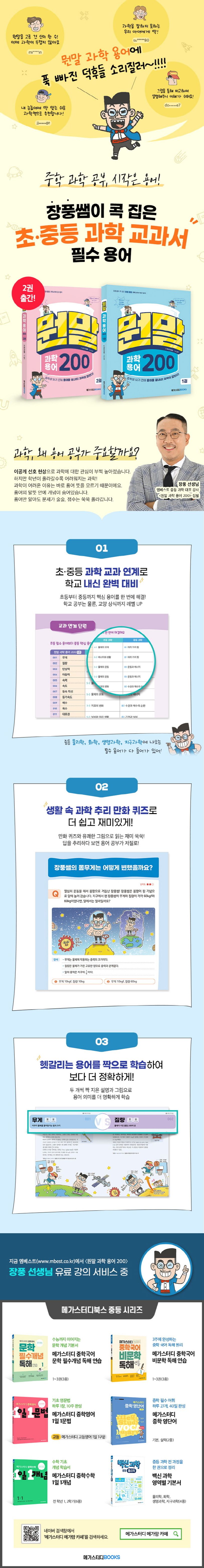 과학은 용어의 말뜻 안에 개념이 들어있는 과목입니다. 따라서 용어만 제대로 알아도 중학 과학을 쉽게 끝낼 수 있습니다. 〈뭔말 과학 용어 200〉은 초등-중등 과학의 헷갈리는 필수 과학 용어 100개를 뽑아, 짝으로 비교해 설명하고 있습니다. 특히 〈뭔말 과학 용어 200〉 2권에서는 중2-3학년 수준의 고난도 용어까지 다루고 있어 보다 체계적인 용어 학습이 가능하도록 구성하였습니다. 만화 퀴즈와 한 장 가득 펼쳐지는 그림은 읽는 재미까지 더해줍니다. 이야기를 읽듯 술술 읽어 나가다 보면 어느새 필수 과학 용어 200개를 완벽하게 끝낼 수 있습니다.