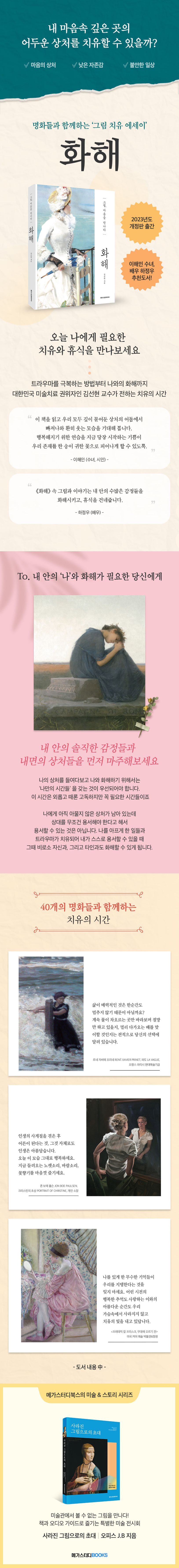 초상화로 유명한 19세기 이탈리아 화가 비토리오 마테오 코르코스의 아름다운 작품 〈작별〉을 넣은 표지는 물론 더 산뜻한 디자인으로 바뀐 본문, 그리고 새롭게 다듬은 문장으로 단장한 《화해》 개정판은 기존 김선현 교수의 따뜻한 미술치료 책을 애정하는 독자들은 물론, 명화를 보며 힐링의 시간을 갖고 싶은 이들에게도 좋은 선물이 될 것이다.