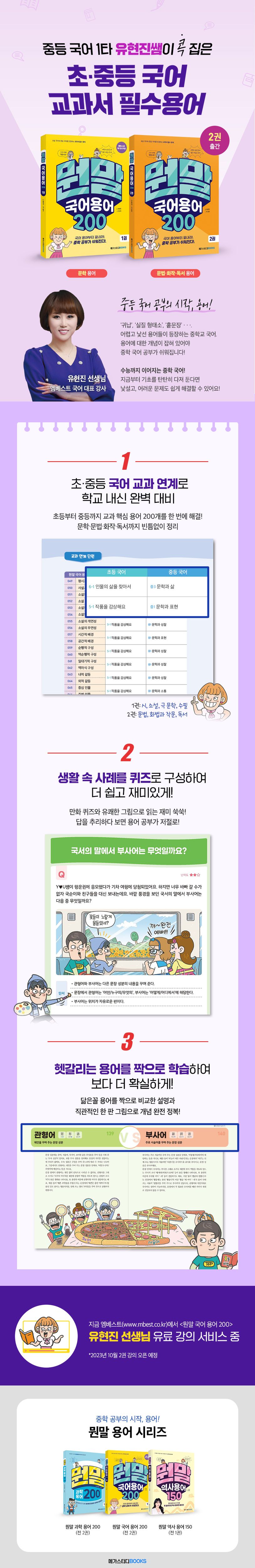 우리말인데 외국어처럼 낯설게 느껴진다면, 수업 시간이나 시험 문제를 풀 때 어디선가 본 듯한데 뭔 뜻인지 말로 설명할 수 없다면 진짜 아는 게 아닙니다. 『뭔말 국어 용어 200』 2권은 초등 - 중등 국어 교과서의 필수 개념 중 여러분을 가장 괴롭히는 ‘문법, 화법과 작문, 독서’ 용어를 명쾌하게! 유쾌하게! 풀어낸 책입니다. 국포자(국어를 포기한 자)가 국능자(국어 능력자)로 성장하는 과정을 만화 퀴즈로 구성하여 학습 동기를 유발하고, 헷갈리는 국어 용어 100개를 짝으로 비교하며, 그림과 스토리텔링을 통해 쉽게 정리했습니다. 재미있게 읽기만 해도 저절로 국어 실력이 향상되는 최고의 학습법으로 용어 학습을 자신 있게 권합니다.