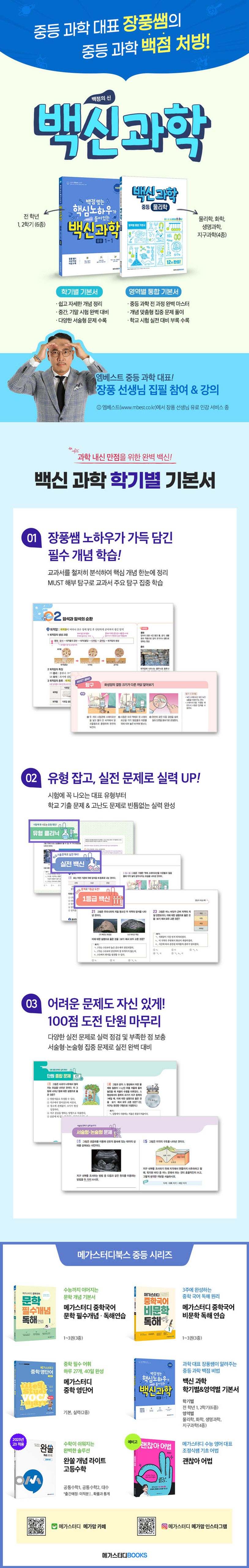 〈백신 과학 중등 3-2〉 (개정판)는 4종의 과학 교과서와 최근 전국 학교 기출 문제를 철저히 분석하여 중요 개념과 최신 기출 경향 문제를 빠짐없이 담았다. 과학의 기본 개념을 탄탄하게 하려는 학생과 시험 만점을 원하는 학생 모두를 위한 과학 기본서이다. 개념을 좀 더 이해하기 쉽게 공부할 수 있도록 장풍쌤의 강의식 첨삭을 달았으며, 시험에 꼭 나오는 빈출 유형 문제를 골라 유형 클리닉에 장풍쌤의 비법을 함께 수록했다. 학교 시험 만점을 대비하여 다양한 서술형 문제를 수록했으며 서술형 만점 열쇠로 서술형의 해법을 담았다. 부록으로, 지난 시간에 배운 기본 개념을 강별로 다시 한번 점검해보는 5분 테스트와 학교에서 실시되는 수행평가 중 가장 많이 실시되는 형태의 수행평가 대비 문제, 학교 시험에 출제되었던 문제로 구성된 중간 기말고사 대비 문제 등을 수록하였다. 엠베스트 장풍 선생님이 15년 동안 축적해 온 노하우를 담아낸 백신 과학은 과학 교재의 중심이 될 것이다.
