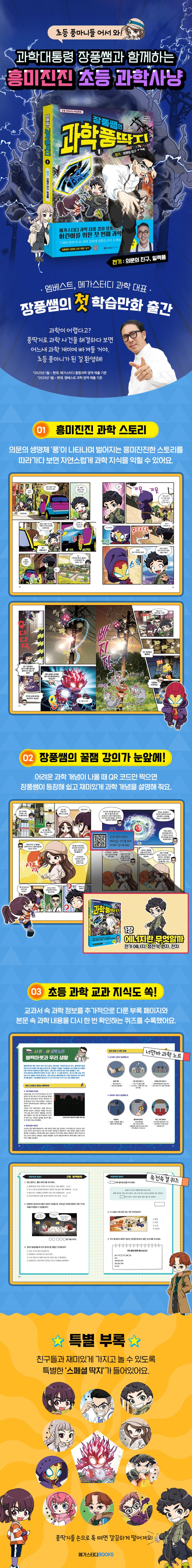 메가스터디 과학 강사 장풍 선생님은 20년간 현장에서 많은 아이들을 만나 왔습니다. 과학을 어려워하는 친구들을 보며 안타까워했고, 좀 더 어릴 적부터 과학을 재미있게 접했던 기억이 모이면, 이후 중ㆍ고등학교에서 과학을 포기하지 않을 거라고 늘 생각했습니다. 그래서 과학의 미래를 이끌어갈 어린이들을 위한 책을 준비하게 되었습니다. 장풍쌤의 시그니처인 ‘풍딱지’로 과학 사건을 해결하고 모험하면서 말이죠. 스토리에는 초중고 과학 내용과 함께 기초 과학의 원리가 자연스럽게 녹아 있습니다. 주인공 친구들의 모험을 따라가면서, 머리에는 과학 지식을 담고 가슴으로는 감동과 재미를 느껴 보세요.