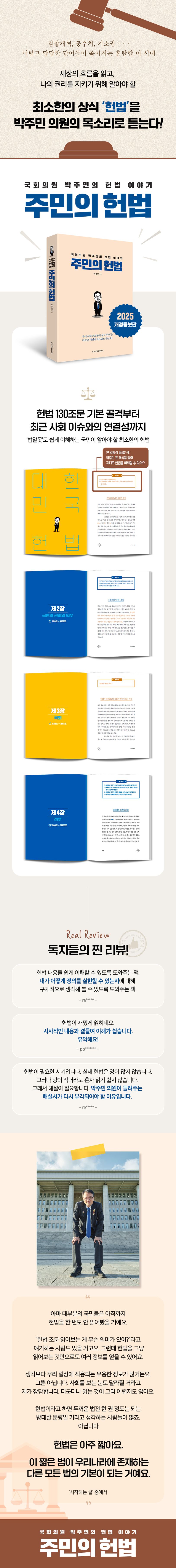 또한 평소 일반인들이 법과 정치에 관심을 갖게 하는 활동에 공을 들여온 저자의 의지대로 이 책은 법의 역사나 법학적 이론 분석이 아닌 일반 국민들의 생활과 직접적으로 연관이 있는 조항의 관련 이슈 및 판례에 포커스를 맞추고 있다. 이와 함께 헌법을 여는 ‘전문’부터 마지막 130조까지 한 조항씩 꼼꼼하게 ‘박주민표 해석’을 달아 기왕 헌법을 읽는 거 처음부터 끝까지 제대로 보고 싶다 하는 ‘정리충’ 독자의 니즈를 충족시킬 구성인 점도 눈여겨볼 만하다. 여기에 『D.P.』 『살아, 눈부시게』 『아직, 불행하지 않습니다』의 유명 일러스트레이터이자 작가인 김보통의 재기발랄한 일러스트가 어우러져 책을 더욱 흥미롭게 만들고 있다.
