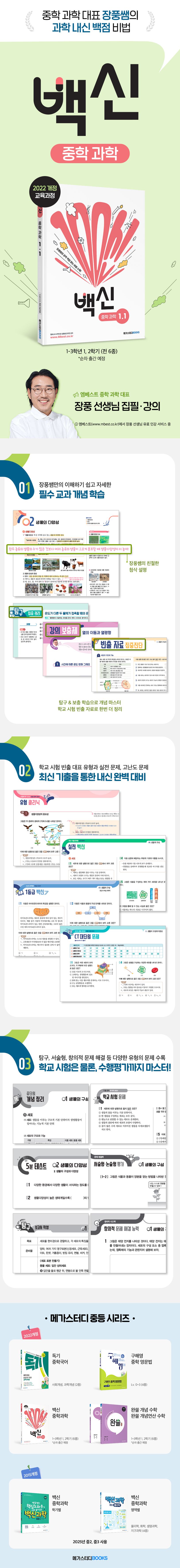 부록으로, 학교에서 실시되는 수행평가 중 가장 많이 실시되는 형태의 수행평가 대비 문제, 학교 시험에 출제되었던 문제로 구성된 중간, 기말고사 대비 문제 등을 수록했다. 엠베스트 장풍 선생님이 20년 동안 축적해 온 노하우를 담아낸 백신 중학 과학은 중학교 과학 교재의 중심이 될 것이다.