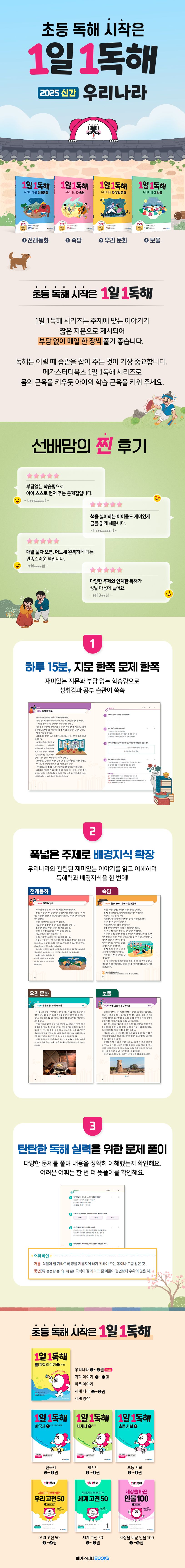 〈1일 1독해〉 시리즈는 주제에 맞는 이야기가 짧은 지문으로 제시되어 부담 없이 매일 한 장씩 풀기 좋습니다. 독해는 어릴 때 습관을 잡아 주는 것이 가장 중요합니다. 메가스터디북스의 〈1일 1독해〉 시리즈로 몸의 근육을 키우듯 아이의 학습 근육을 키워 주세요.