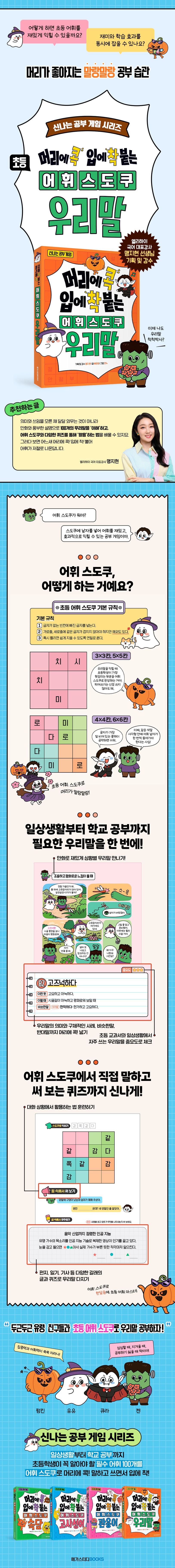 어휘력이 부족한 어린이들은 생활 속에서 예상치 못한 상황을 경험하기 쉽습니다. 친구에게 솔직하게 기분을 표현했다가 얼굴을 붉히기도 하고, 선생님한테 숙제를 깜빡한 이유에 대해 설명하다가 말이 뒤엉켜 버리기도 하지요. 이때, 어휘의 이미와 쓰임을 제대로 알면 하기 어렵거나 듣기 싫은 말도 간결하고, 재치 있게 주고받을 수 있습니다. 메가스터디북스에서는 어휘 스도쿠를 통해 똑똑하게 의사소통하고, 다양한 어휘를 익힘으로써 공부의 기본기를 바로잡을 수 있도록 『머리에 콕 입에 착 붙는 어휘 스도쿠 우리말』을 출간했습니다!
