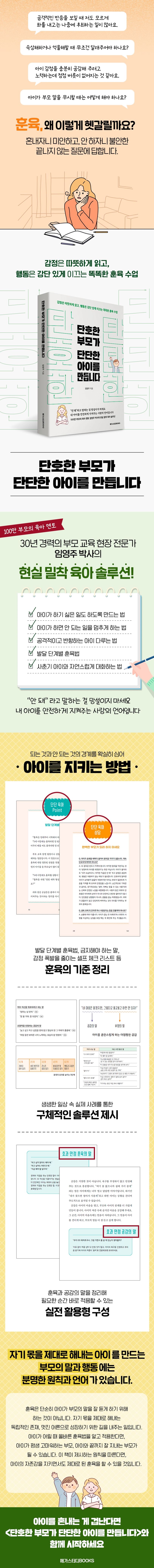 떼쓰고 고집부리는 아이, 규칙을 지키기 어려워하는 아이, 해야 할 일을 미루거나 작은 어려움에도 쉽게 무너지는 아이들. 부모는 늘 최선을 다하지만, 예측할 수 없는 아이의 반응 앞에서 종종 당황하고 지친다. 엄하게 혼내도 잠시뿐인 것 같고, 상처받을까 두려워 쉽게 단호해지지 못하는 부모들을 위해 부모교육 전문가 임영주 박사가 본격 훈육서 《단호한 부모가 단단한 아이를 만듭니다》를 펴냈다. 이 책은 아이에게 화내지 않으면서 떼쓰기를 멈추는 법, 해야 할 일을 해내고, 하지 않아야 할 일은 멈추게 하는 방법을 단계별로 제시한다.