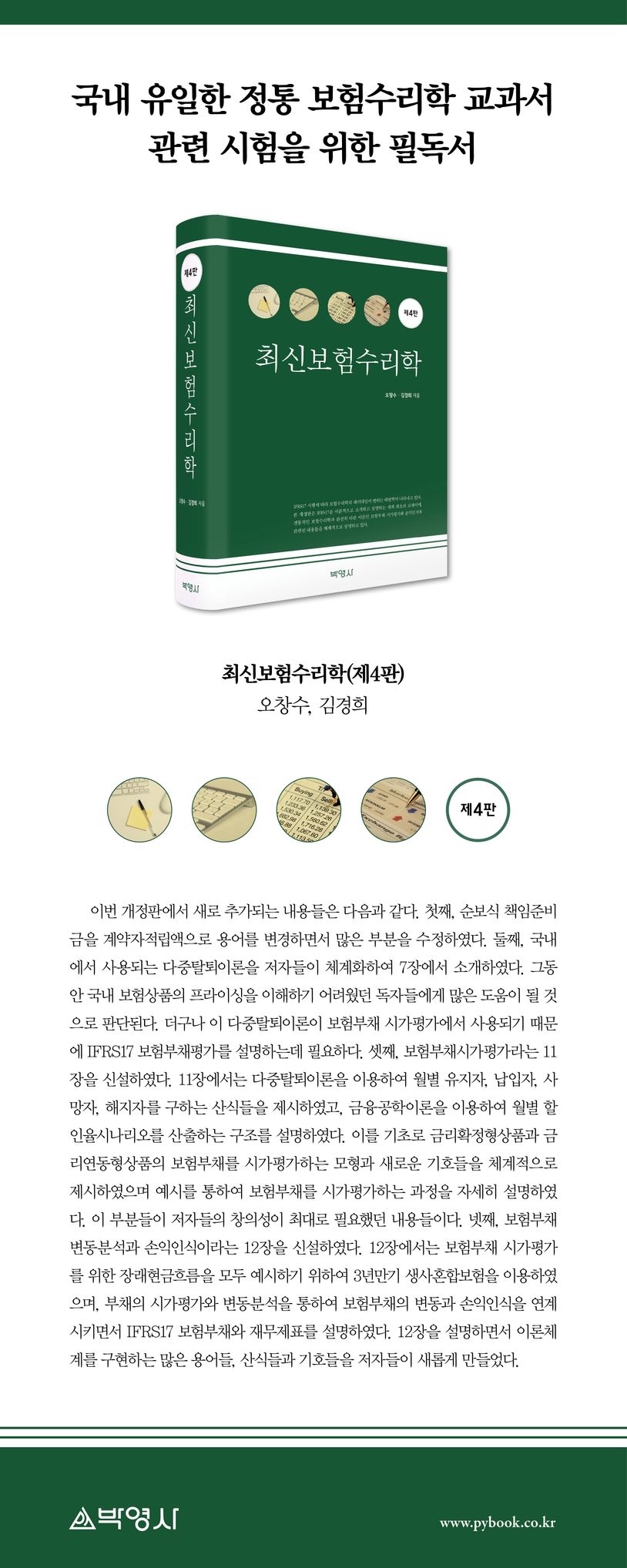이번 개정판에서 새로 추가되는 내용들은 다음과 같다. 첫째, 순보식 책임준비금을 계약자적립액으로 용어를 변경하면서 많은 부분을 수정하였다. 둘째, 국내에서 사용되는 다중탈퇴이론을 저자들이 체계화하여 7장에서 소개하였다. 그동안 국내 보험상품의 프라이싱을 이해하기 어려웠던 독자들에게 많은 도움이 될 것으로 판단된다. 더구나 이 다중탈퇴이론이 보험부채 시가평가에서 사용되기 때문에 IFRS17 보험부채평가를 설명하는데 필요하다. 셋째, 보험부채시가평가라는 11장을 신설하였다. 11장에서는 다중탈퇴이론을 이용하여 월별 유지자, 납입자, 사망자, 해지자를 구하는 산식들을 제시하였고, 금융공학이론을 이용하여 월별 할인율시나리오를 산출하는 구조를 설명하였다. 이를 기초로 금리확정형상품과 금리연동형상품의 보험부채를 시가평가하는 모형과 새로운 기호들을 체계적으로 제시하였으며 예시를 통하여 보험부채를 시가평가하는 과정을 자세히 설명하였다. 이 부분들이 저자들의 창의성이 최대로 필요했던 내용들이다. 넷째, 보험부채 변동분석과 손익인식이라는 12장을 신설하였다. 12장에서는 보험부채 시가평가를 위한 장래현금흐름을 모두 예시하기 위하여 3년만기 생사혼합보험을 이용하였으며, 부채의 시가평가와 변동분석을 통하여 보험부채의 변동과 손익인식을 연계시키면서 IFRS17 보험부채와 재무제표를 설명하였다. 12장을 설명하면서 이론체계를 구현하는 많은 용어들, 산식들과 기호들을 저자들이 새롭게 만들었다.