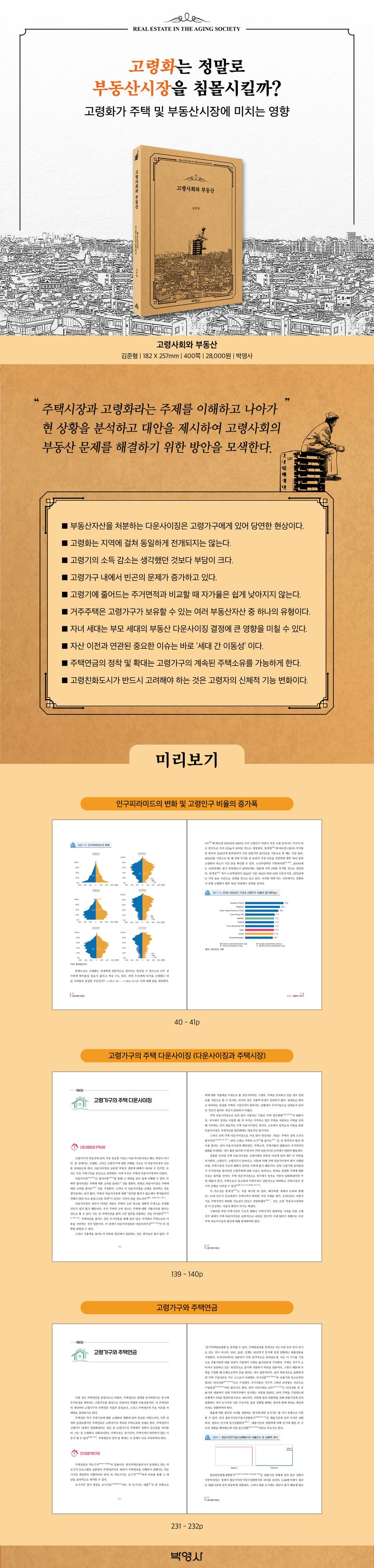 또한 본 도서가 고령사회와 부동산에 대해 향후 함께 미래를 만들어 나아가기 위한 지침서 역할을 수행하길 바란다.