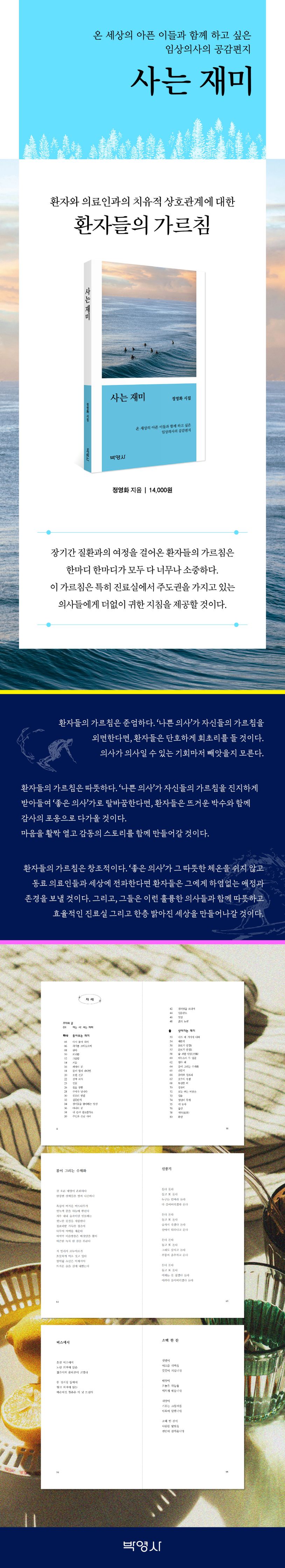 초대의글01여는시:사는재미하나돌아보는재미05다시물이되어06과거를쓰다듬으며08살다10보리밥12그믐달14처음16패자의꿈18둘이합쳐하나면20오랜친구22진짜의사25연꽃26볶음짬뽕28부아가납니다30위로의방법32결혼반지34장미꽃을좋아하는당신36아내의꿈38내손이필요한가요39주인과손님사이42검버섯을보내며44임플란트46헛심48흙의노래둘살아가는재미53네가왜거기서나와54체중계56돋보기안경157돋보기안경258술취한단풍(丹楓)60야누스의두얼굴62엄마왜64봄이그리는수채화65선풍기66봄비와청보리67호수의속셈68무심한비70장맛비72오늘부는바람은73얼음74엉덩이무게75이놈아76불신78서사(敍事)80환생셋뛰노는재미83아픈기억84재회86지우개88바퀴벌레의후회90고양희양의고양이92새끼발가락94버스에서95소맥한잔96엄마오리의선택98호접란,다시찾아온당신100길다101지난밤폭설102낙엽104신호등앞에서105저아시겠어요106아까운사랑108사자의사슴사냥법110내일만은112윤회114시련넷꿈꾸는재미117인연118돼지껍데기120생채기122갈대예찬124설국모자(雪國母子)126세월아네월아128아몬드케이크130화장실이부른다132볍씨유전134불은물이시원하다135미루고살자136무궁화꽃이피었습니다138별말씀140사이141아끼면142억새의꿈144장타의비결146함박눈1147함박눈2148맺는시:최적온도150해설:자연인,의사,시인으로서의시학-김순진168붙이는글