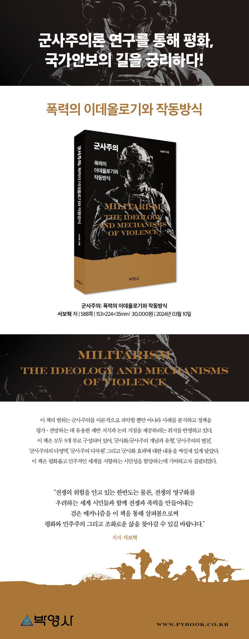 이책을출간하지만그기쁨보다도세계도처에서전쟁이진행되고한반도에서도긴장이높은현실에무거운마음을금할수없다.전쟁과폭력이인간사의필요악인지는모른다.그런전제위에서있는지몰라도전쟁법과국제인도법으로전쟁을제한하는노력또한인간이추구하는바이다.그런데우크라이나접경지역과가자지구일대에서벌어지는전쟁범죄와반인도적범죄는군사주의를자연스러운인간문화의하나로치부하기에는심각한작태가아닐수없다.국가차원에서보자면,국민의생명과복리와직결되는정책을국민의의사를충분히수렴하지않고소수권력집단이일방적으로결정하고집행하는행태와그것이문제가아니라는사고가바로군사주의적현상에다르지않다.군사주의에관심을갖고깨어있어야평화는물론민주주의도,생태주의도,인권보호도가능함을재확인한다.사람을죽이는일에직간접적으로관여하면서나자신과가족그리고자기국가의안녕을추구하는지독한모순을‘현실주의’로변명하는것은자기기만이자위선에다르지않다.군사주의를오늘까지의우리를성찰하고,공감하고공존하는내일을설계하는안내자로소개하고싶었다.전쟁의위험을안고있는한반도는물론,전쟁의영구화를우려하는세계시민들과함께전쟁과폭력을만들어내는검은메커니즘을살펴보고자하였다.그럴때평화와민주주의그리고조화로운삶을찾아갈수있을것이라생각하였다.