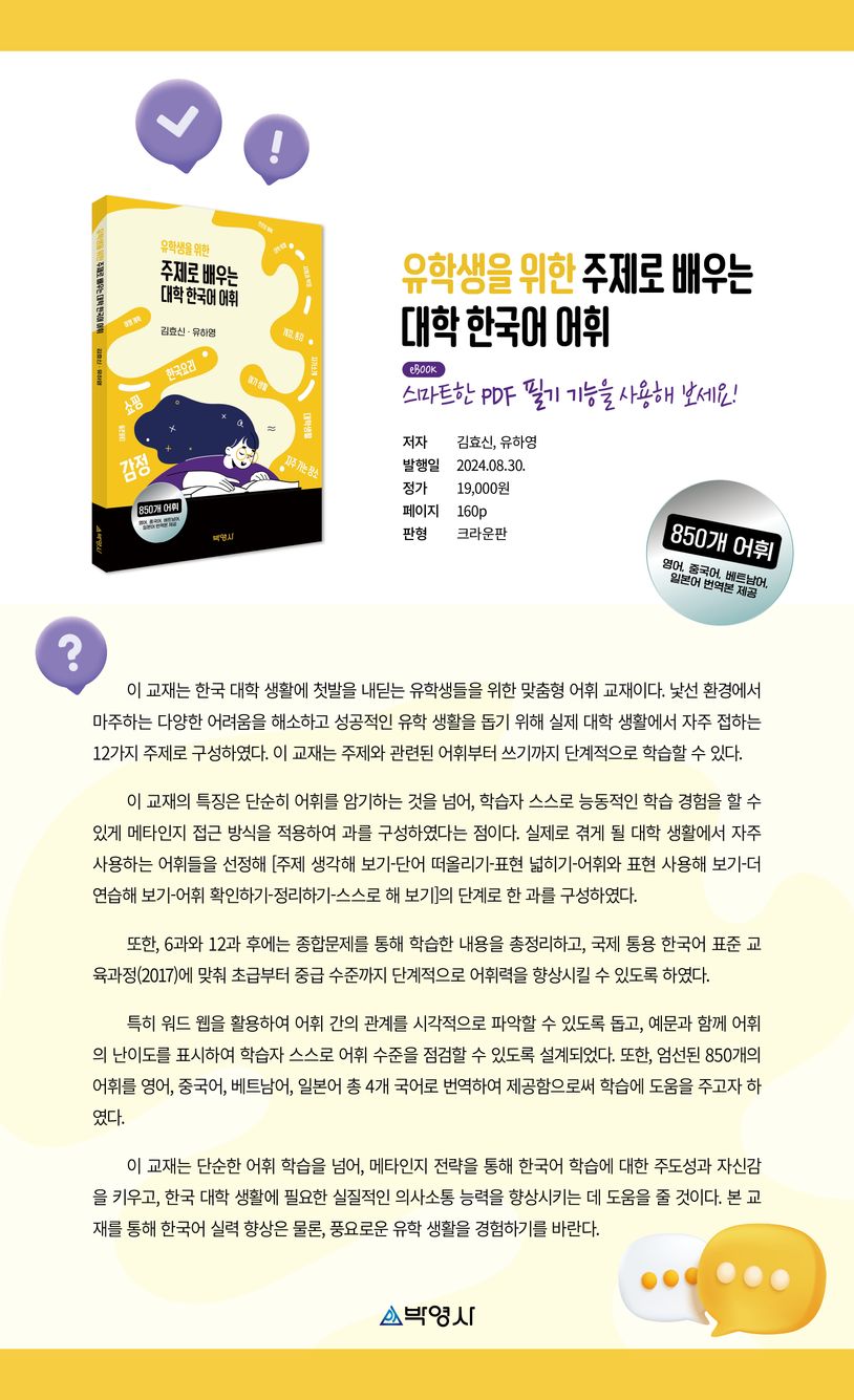 1과대학생활수강신청은어떻게해요?32과자기소개저는제니라고합니다113과자주가는장소한강공원에서자주자전거를타곤했어요194과대학축제이번주목요일에유명한가수가온대요275과시험과학점학점은어떻게확인해요?356과대중교통지하철을자주이용하는편이에요43종합문제(1~6과)517과한국요리제가좋아하는잡채를만들었어요578과여행계획방학때태국으로여행을갈까해요659과쇼핑배송도빠르고서비스도좋던데요7310과여가생활한국요리를배우고있어요8111과감정스트레스때문에잠이안와요8912과진로와계획진로를선택할때는적성이중요해요97종합문제(7~12과)105부록1스스로해보기모범답안110부록2종합문제정답122부록3어휘색인123부록4어휘연습157