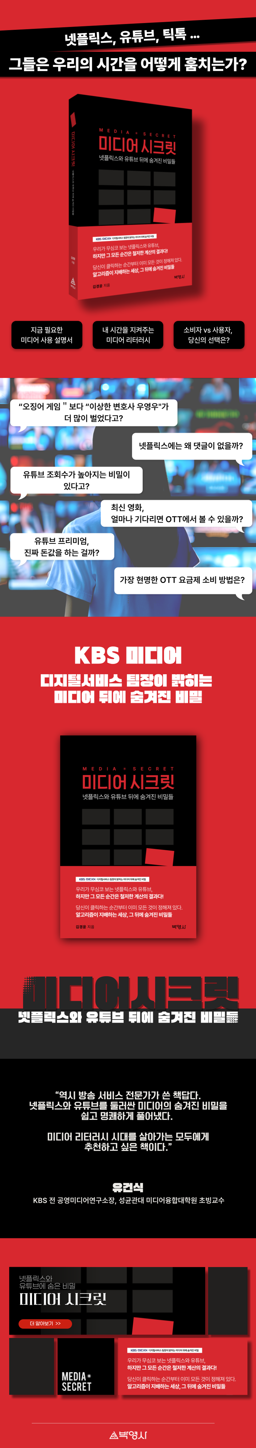 우리가 매일 만나는 미디어, 그리고 그 뒤에 숨겨진 비밀들. 우리는 아무리 바빠도 일주일 평균 69시간 동안 온라인에 머무르면서 그중 영상 콘텐츠에 12시간을, 넷플릭스나 유튜브 같은 플랫폼에만 7시간 반을 쏟아붓는다. 아침에 눈을 뜨자마자 스마트폰을 확인하고, 출퇴근길은 물론 잠들기 전까지 미디어를 끊임없이 소비하는 삶. 이 책은 그런 일상이 너무나도 당연해진 시대에 던지는 질문에서 출발한다. “왜 우리는 영상 보는 것을 멈출 수 없을까?”, “왜 플랫폼은 우리의 시선을 이토록 집요하게 사로잡으려 할까?” 『미디어 시크릿』은 넷플릭스, 유튜브 등 주요 플랫폼의 작동 원리와 그 이면에 숨겨진 기술과 심리, 구조를 흥미로운 구성으로 담아낸 미디어 입문서다. 누구나 이해할 수 있을 만큼 쉽게 풀어낸 내용으로 모두가 현명하게 미디어를 소비할 수 있는 방법을 제안한다. 지금 이 책으로, 당신의 소중한 시간을 지키는 미디어 리터러시의 첫걸음을 시작해보자.
